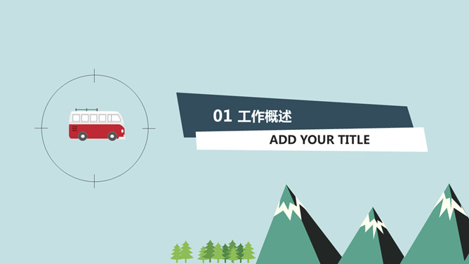 扁平化卡通公交车PPT模板。一套扁平化矢量卡通工作汇报总结幻灯片模板,追逐公交车图形,所有元素均可编辑。
