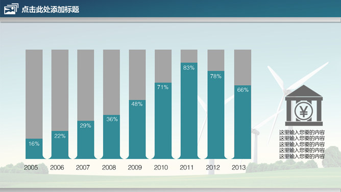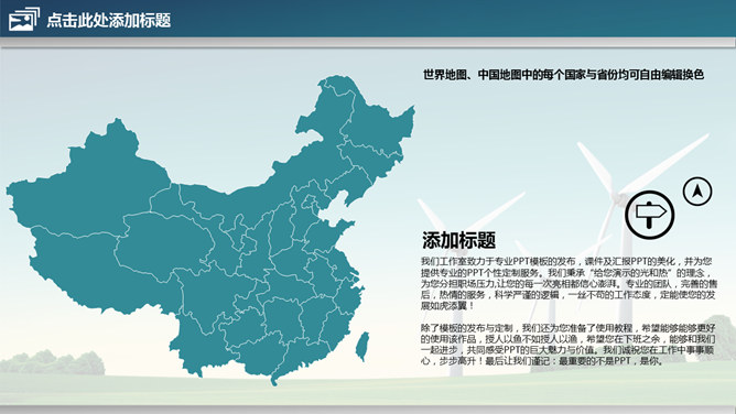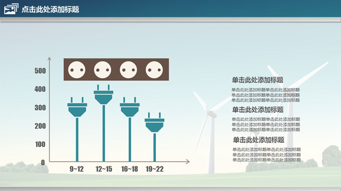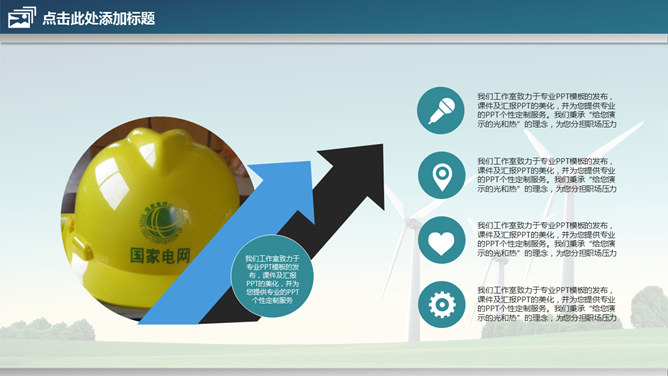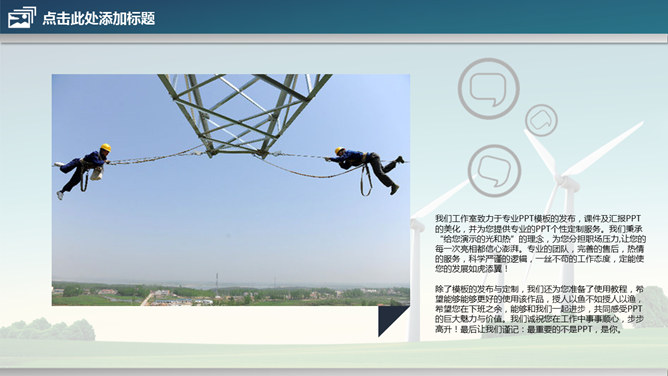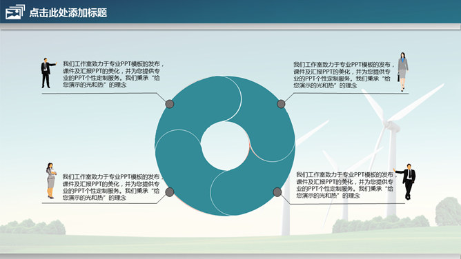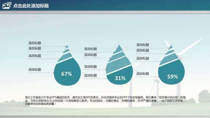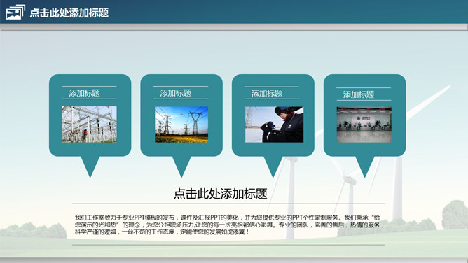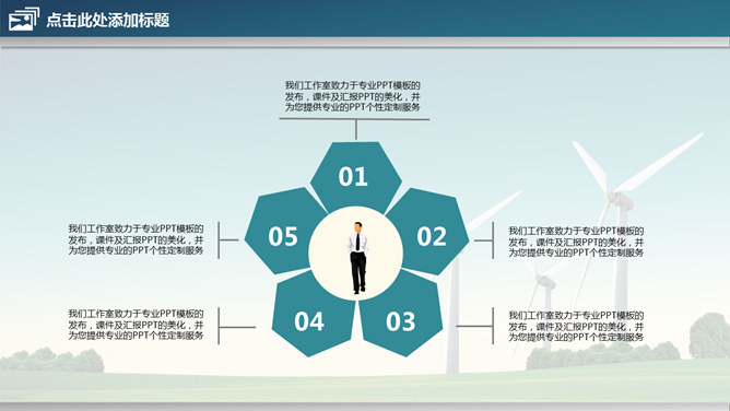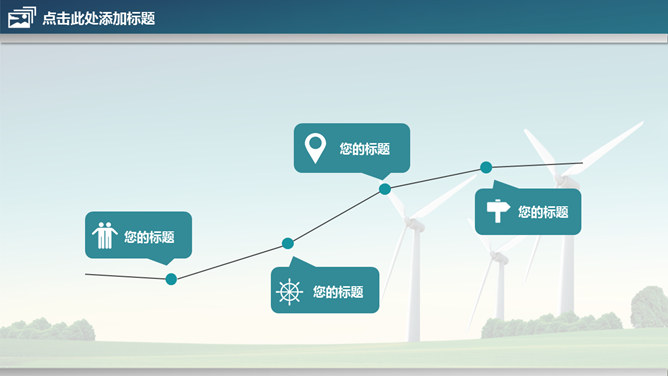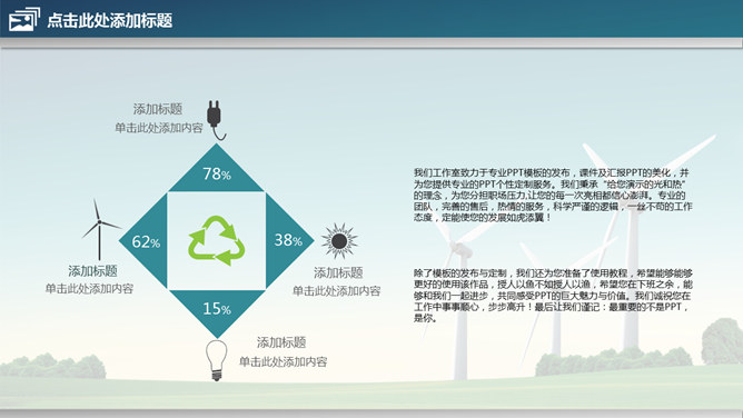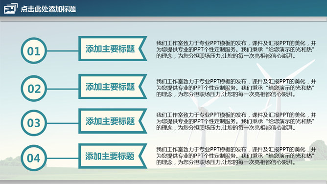 风车风力发电绿色能源PPT模板。这是一份环保主题相关的幻灯片模板,首页以风力发电的风车为背景,绿色的主色调,适用于环保清洁能源相关的主题。