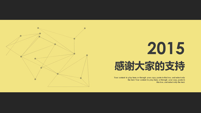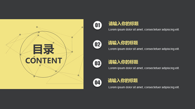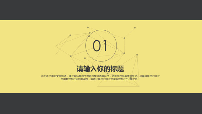 黑黄点线粒子动态PPT模板。一套通用动态幻灯片模板,经典黑黄配色,点线粒子效果,简约杂志风设计风格。
