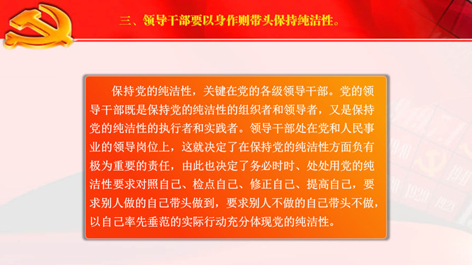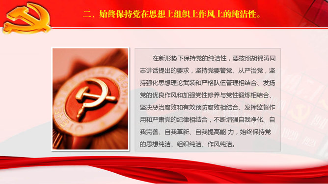 这是一份保持党的纯洁性的PPT范文,以国旗党徽为背景,动态效果,适合党建工作,党员宣传教育使用。