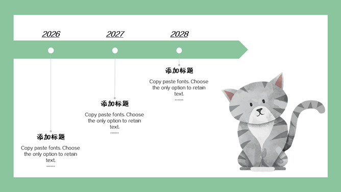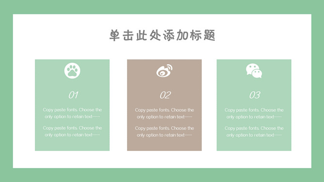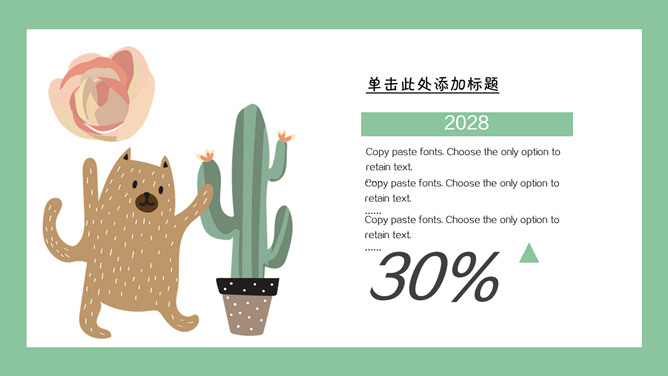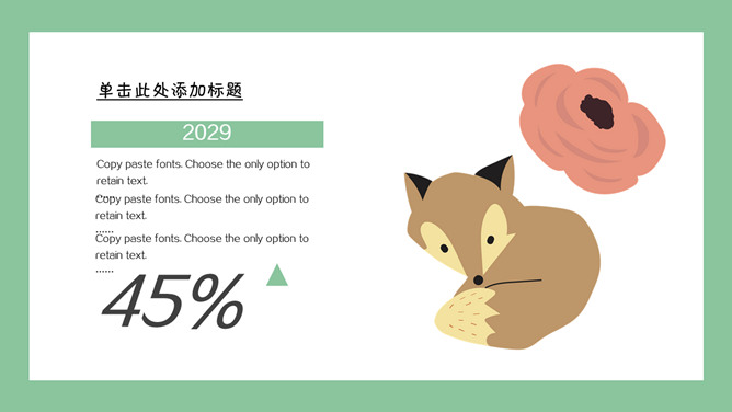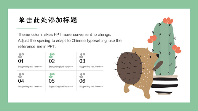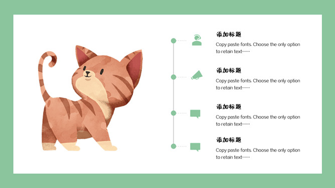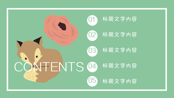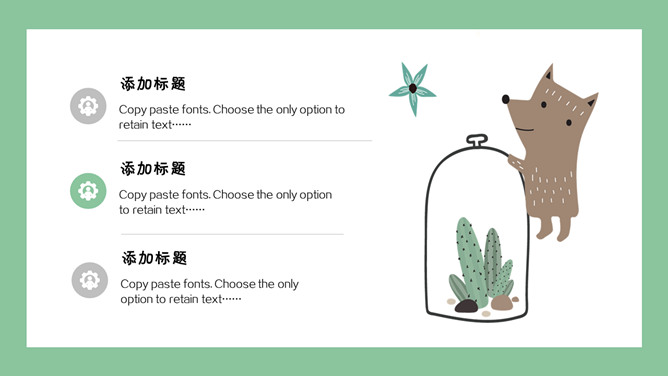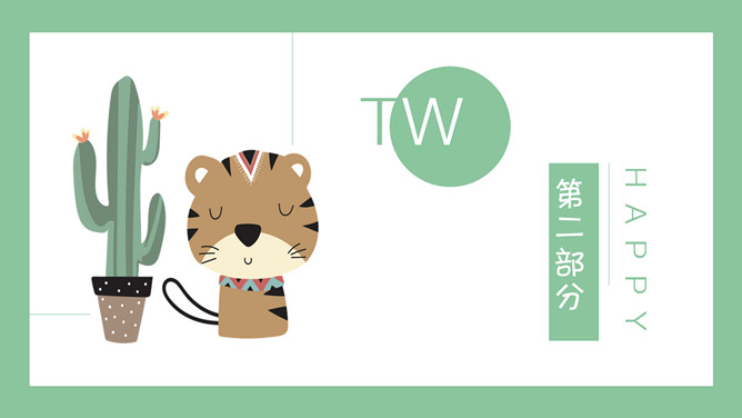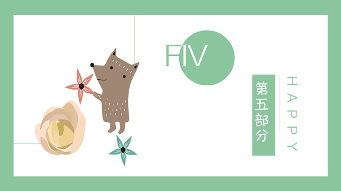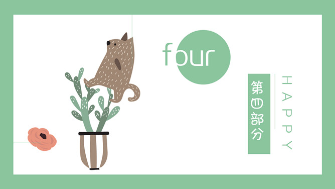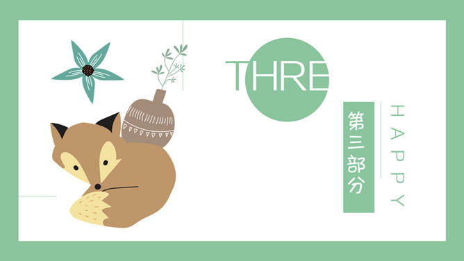 清新可爱卡通小动物PPT模板。一套卡通风格模板,清新绿色背景,各种插画风可爱小动物元素。