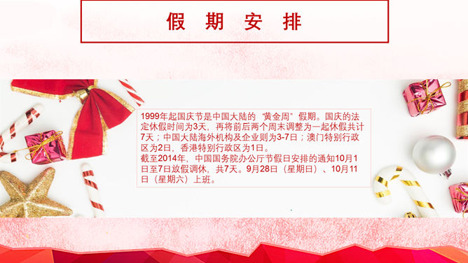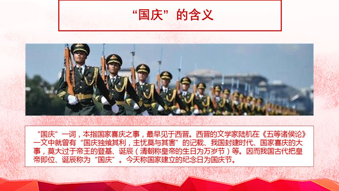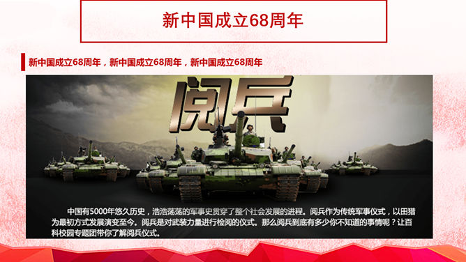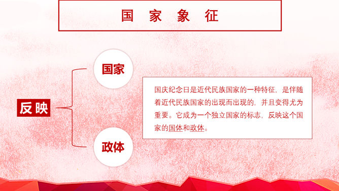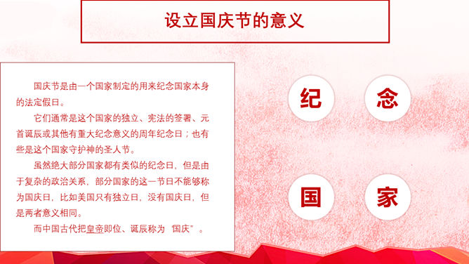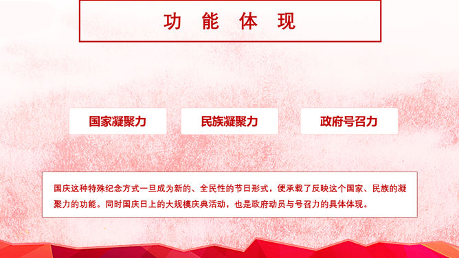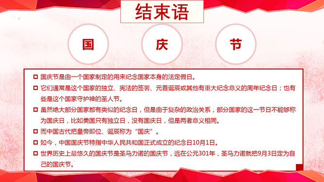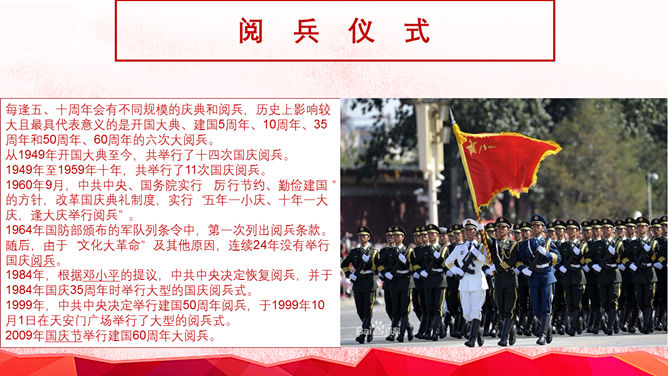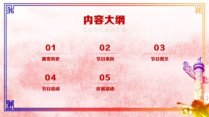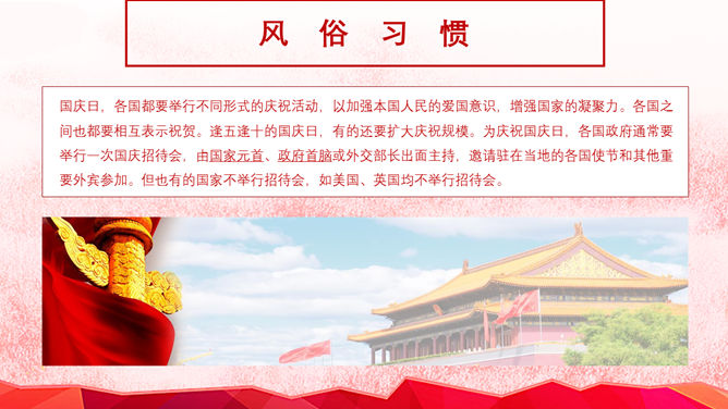 这是一份大气的幻灯片模板,以华表、天安门为背景元素,红色的主色调,烘托出喜庆的节日气氛,适合庆祝国庆节活动使用,共22页,包含多种页面。