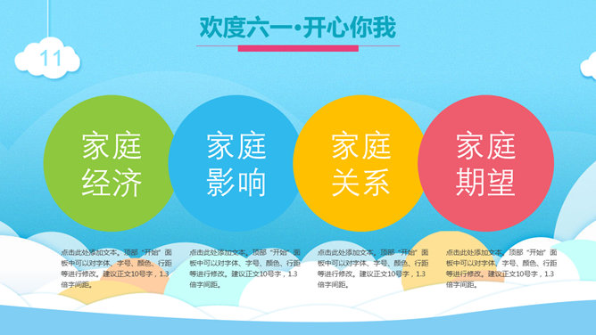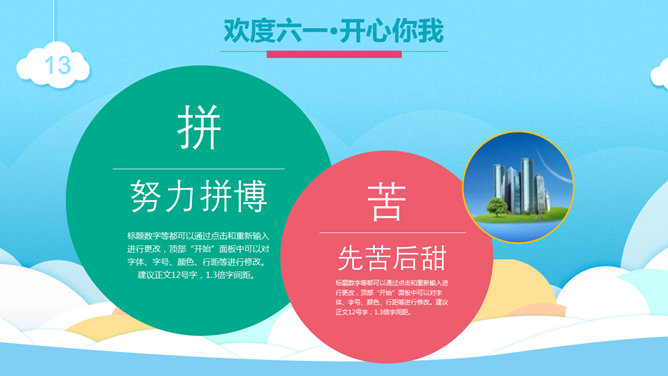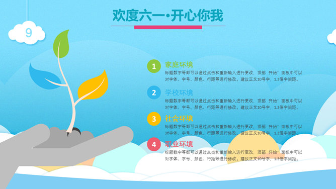 这是一份儿童节主题的PPT模板,用蘑菇、飞舞的蝴蝶和可爱的小孩为背景元素,卡通化的风格,更容易被小孩接受。
