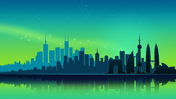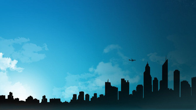 矢量卡通城市楼群剪影的幻灯片背景图片,白色的底色配色浅蓝色的色调,给人简约清新的感觉。