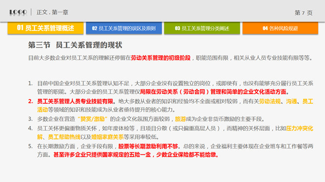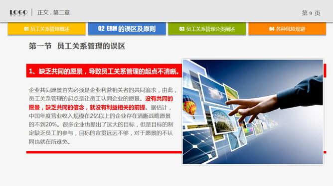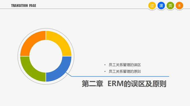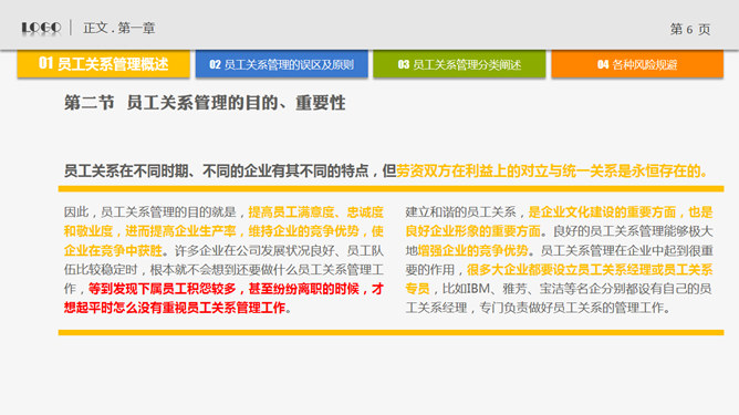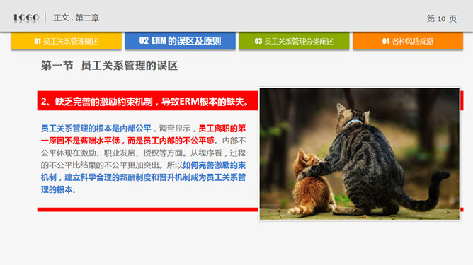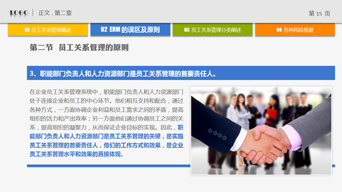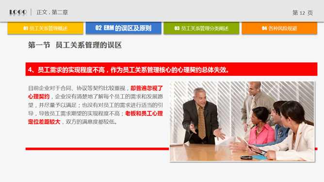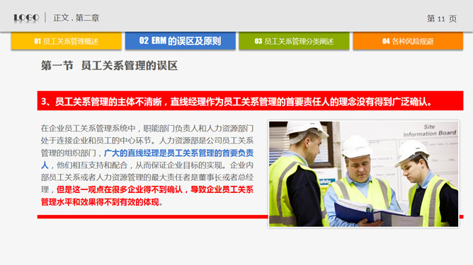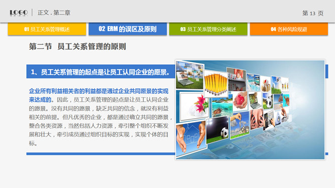 这是一份来自布衣公子的关于员工关系管理的PPT培训课件,从员工关系管理概述、ERM的误区及原则、ERM的分类阐述和各种风险规避四个方面进行阐述,内容非常丰富,非常专业,外加漂亮的动态效果,是一份不可多得的优秀课件。