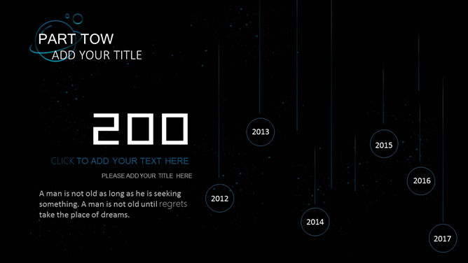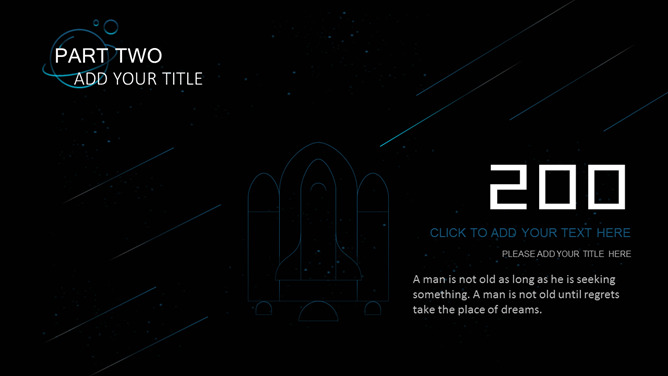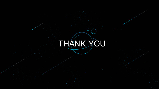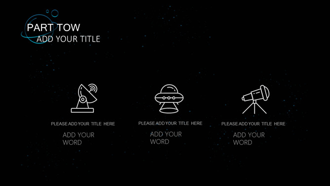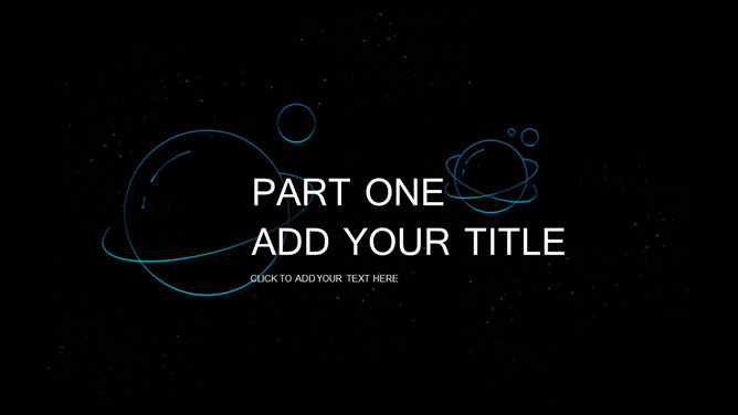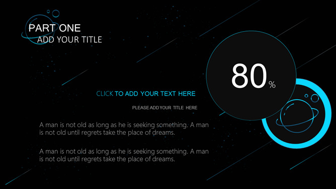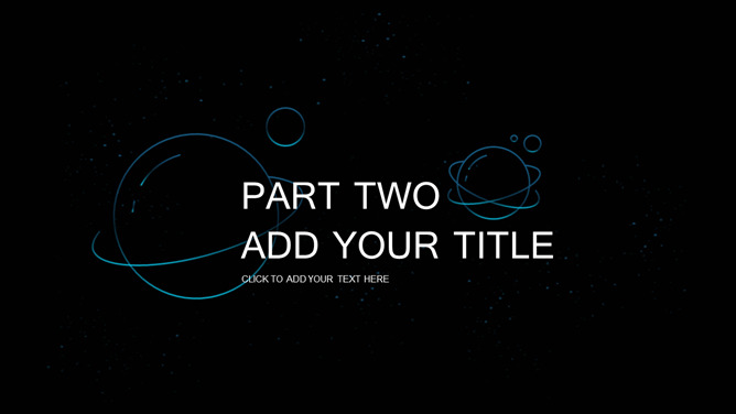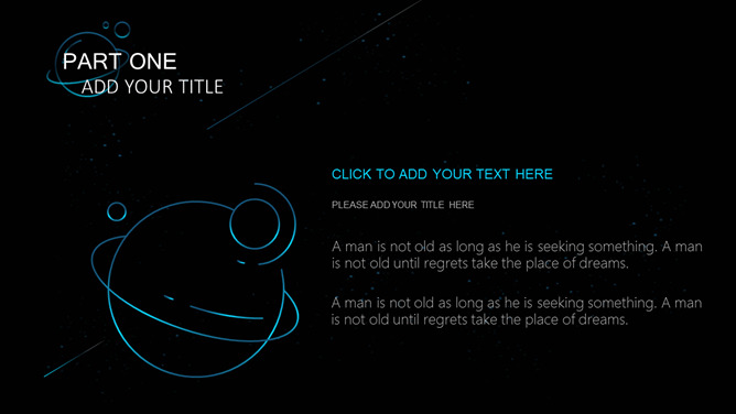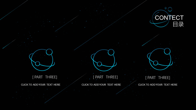 宇宙星球动态流星PPT模板。一套简约精美星空风幻灯片模板,蓝色荧光科技感视觉,动态流星效果设计。