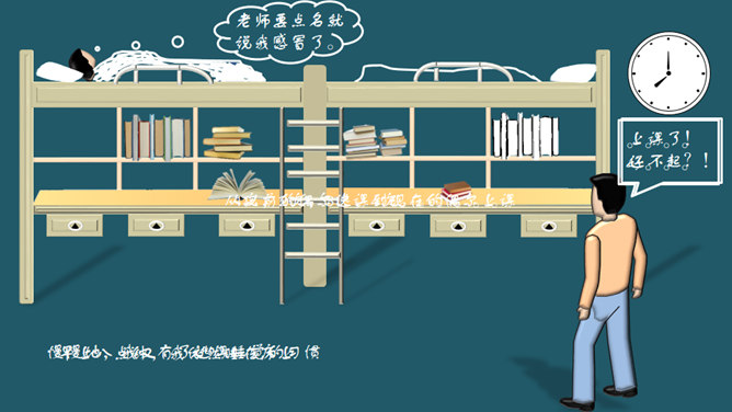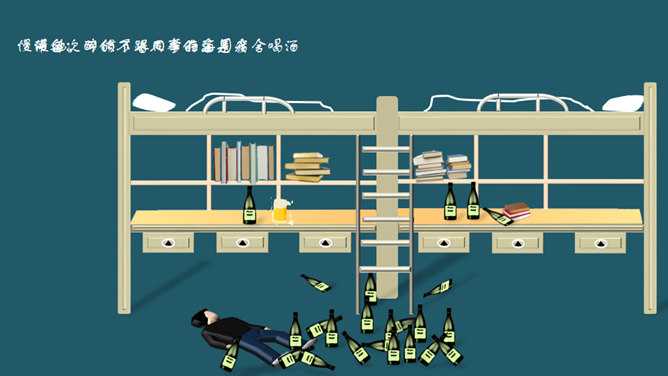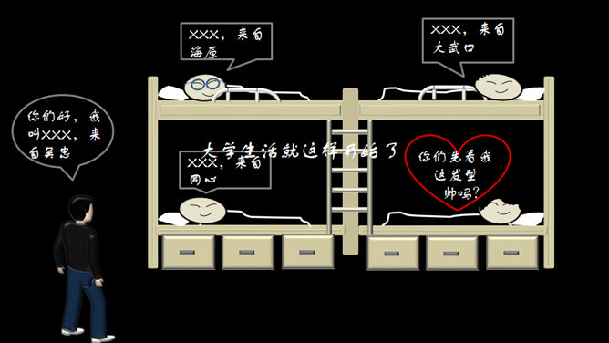 。作者从一个激情无限的大一新生转变成一个宿舍宅男,到最后的幡然悔悟,情景化的动画效果,非常生动,很能引起以前上过大学或现在在读的大学生的共鸣。