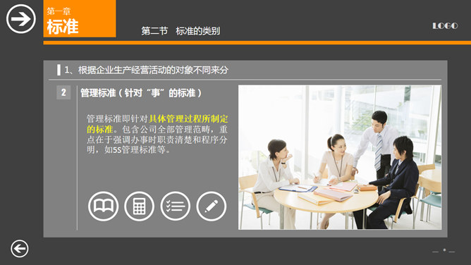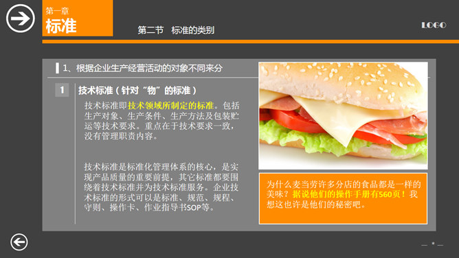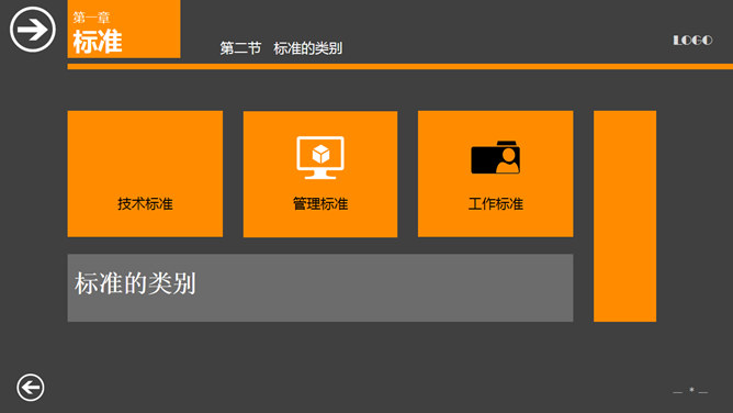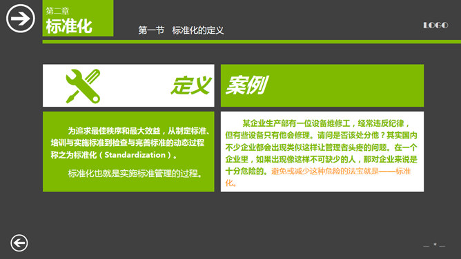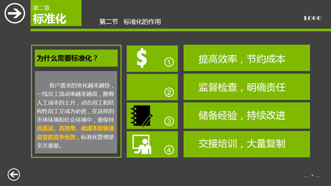 课件,宽屏版式,动态效果,共39页,内容非常丰富专业,包括标准和标准化两部分内容。适合用于中层经理管理人员的培训使用。