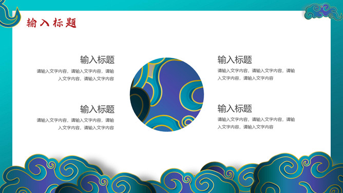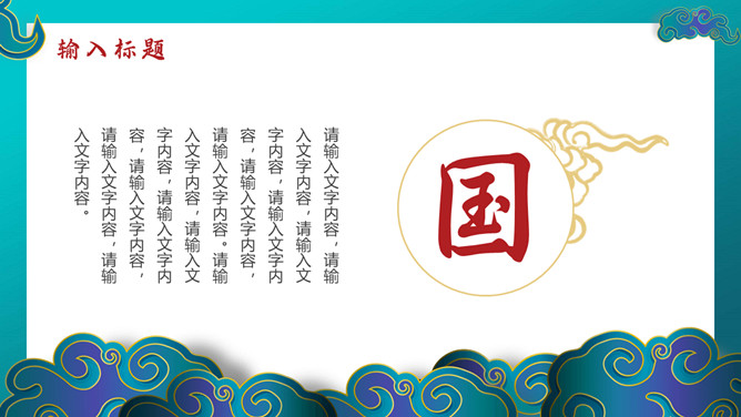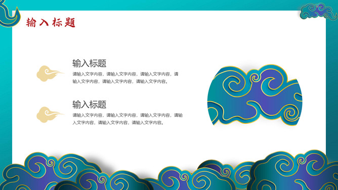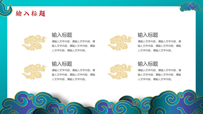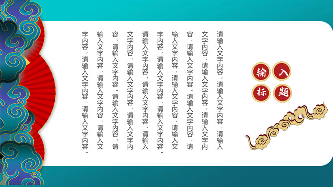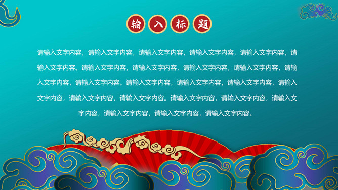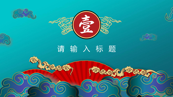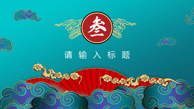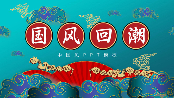时尚华丽国潮风PPT模板。一套时尚国潮风模板,搭档红蓝撞色配色,祥云、扇子等古典元素装饰。