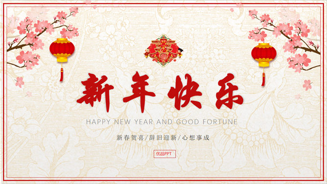 这是一份喜庆新年主题的幻灯片模板,红色灯笼、花朵装饰,突出喜庆的节日气氛,可用于春节拜年使用。