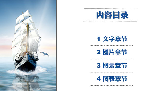 大海帆船乘风破浪PPT模板。这是一份以帆船在大海中乘风破浪航行为背景的幻灯片模板,共32页,包含众多的图形图表页,适合励志、竞聘、汇报使用。建议安装字体: