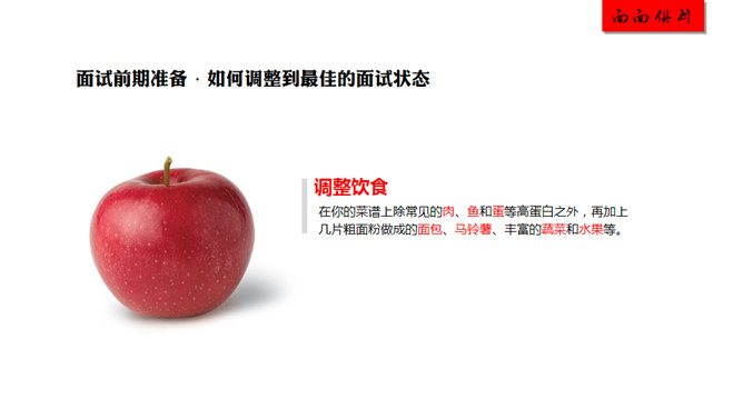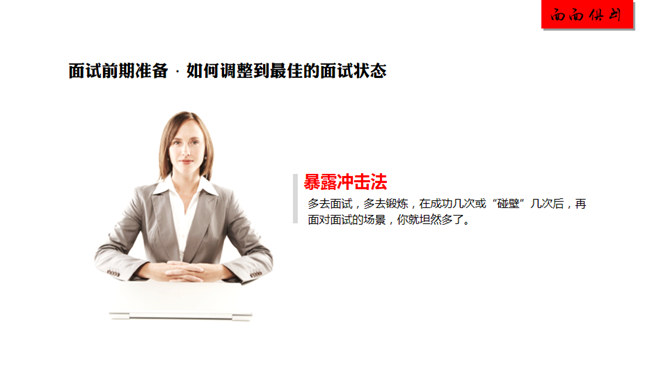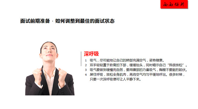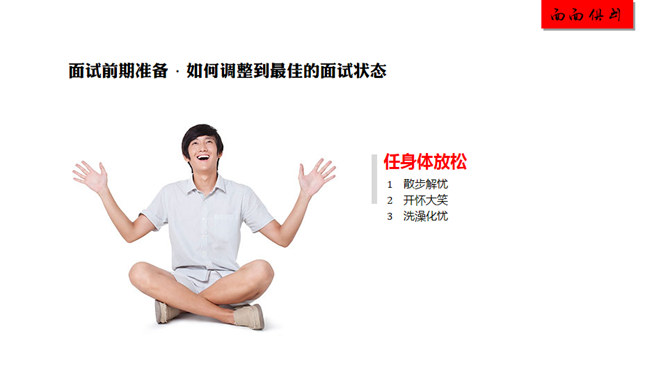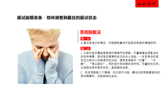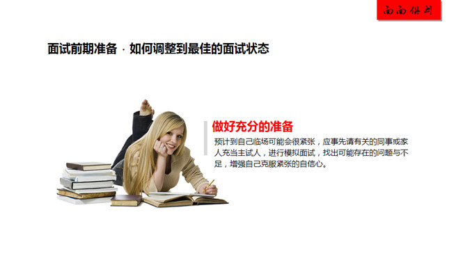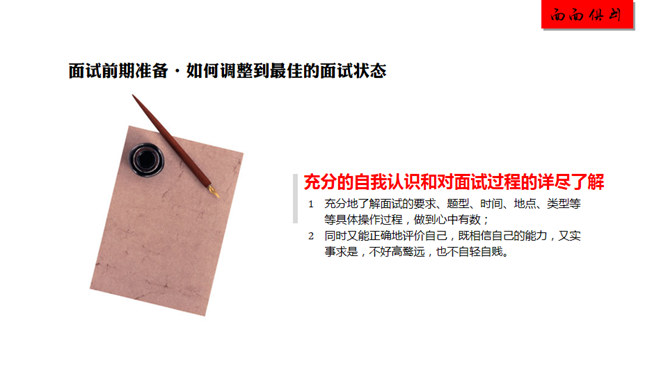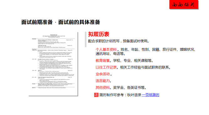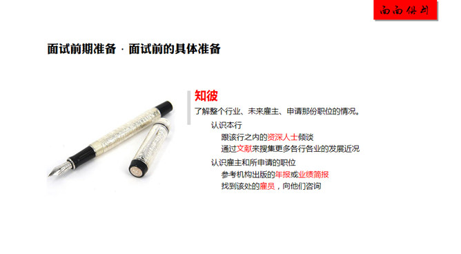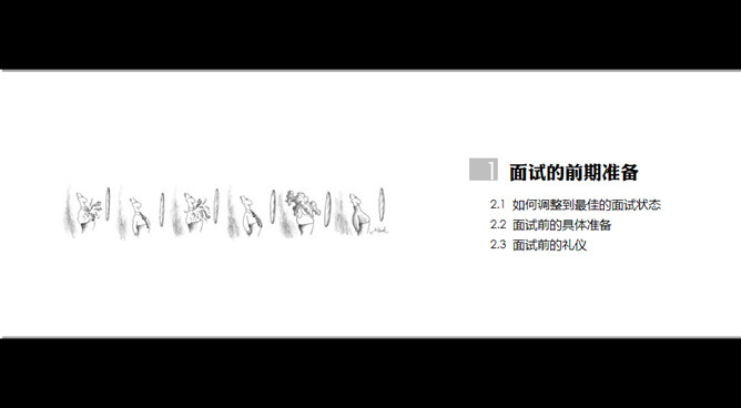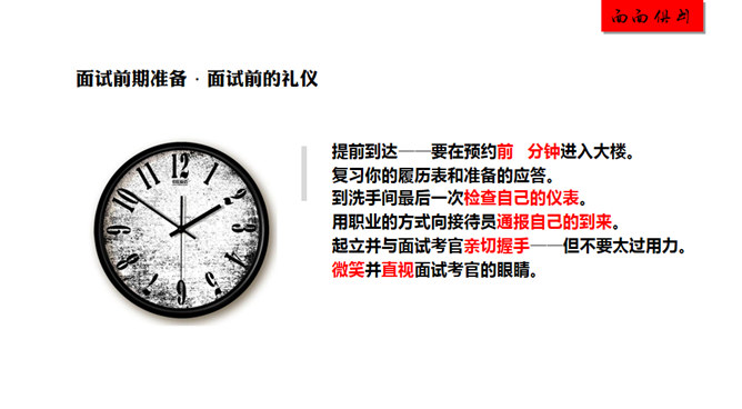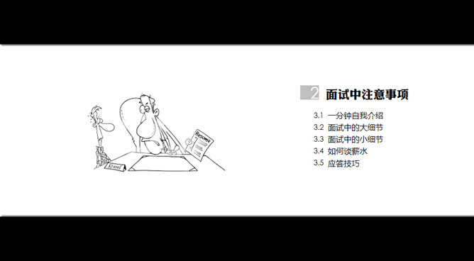 这是一份面试技巧培训课件,内容非常全面,从面试前期准备、面试中的注意事项和面试结束注意事项三项进行讲解。使用字体: