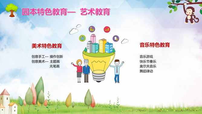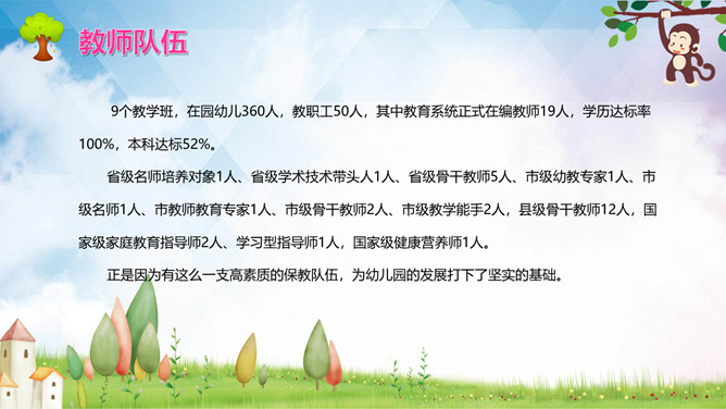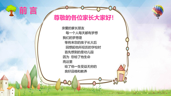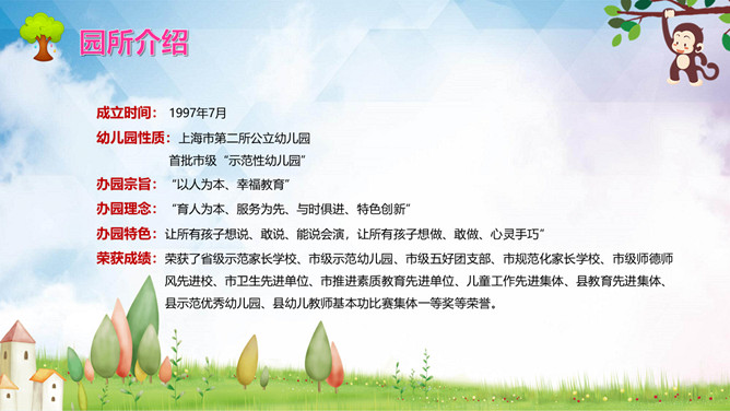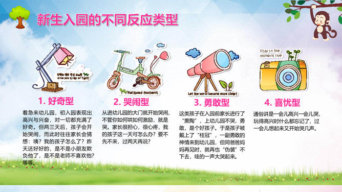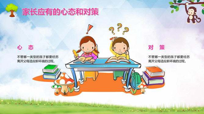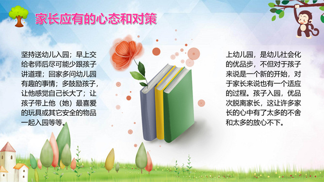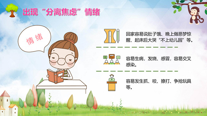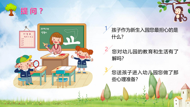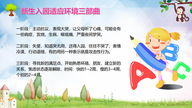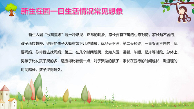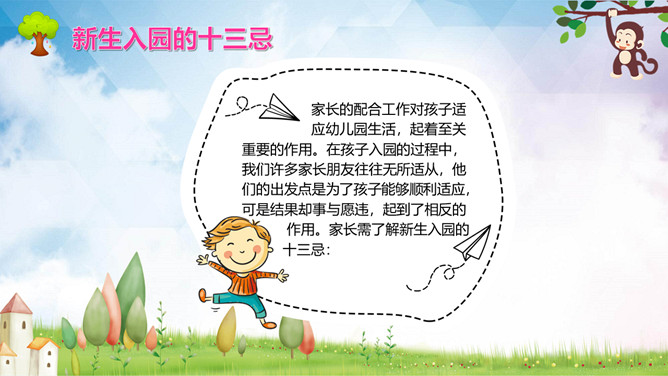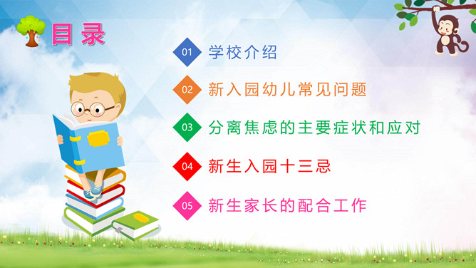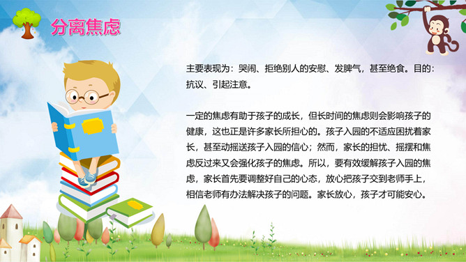 幼儿园开学缓解孩子焦虑PPT模板。内容包括学校介绍、新入园幼儿常见问题、分离焦虑的主要症状和应对、新生入园十三忌、新生家长的配合工作。