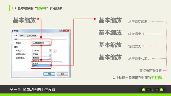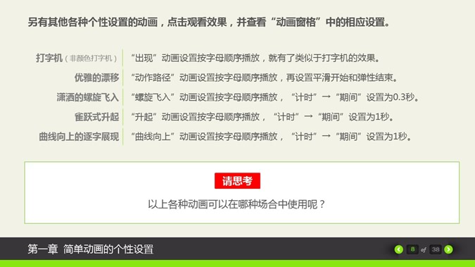这是一个PPT动画设计的基础教程,共38页,讲解的细致到位,简单易懂。包括:1、简单动画的个性设计。2、单个对象的组合设计。3、多个对象的组合设计。4、典型动画的应用举例。