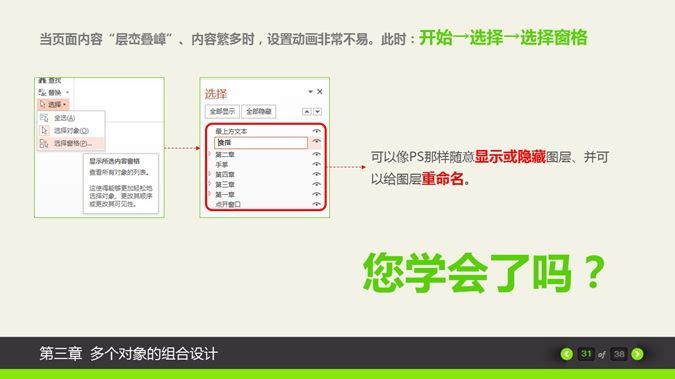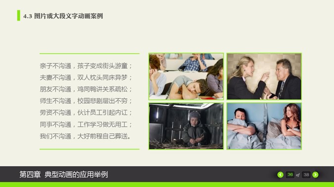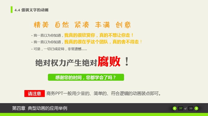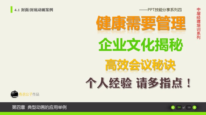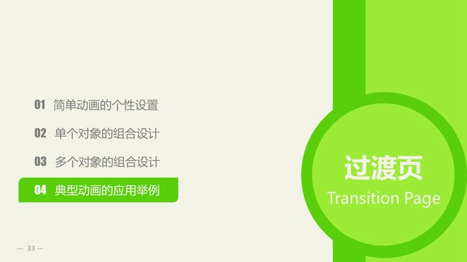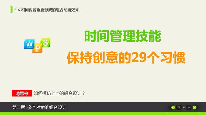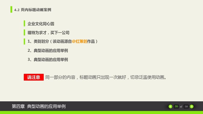 这是一个PPT动画设计的基础教程,共38页,讲解的细致到位,简单易懂。包括:1、简单动画的个性设计。2、单个对象的组合设计。3、多个对象的组合设计。4、典型动画的应用举例。