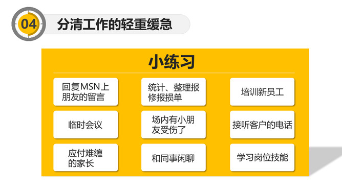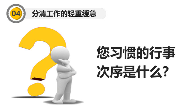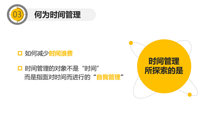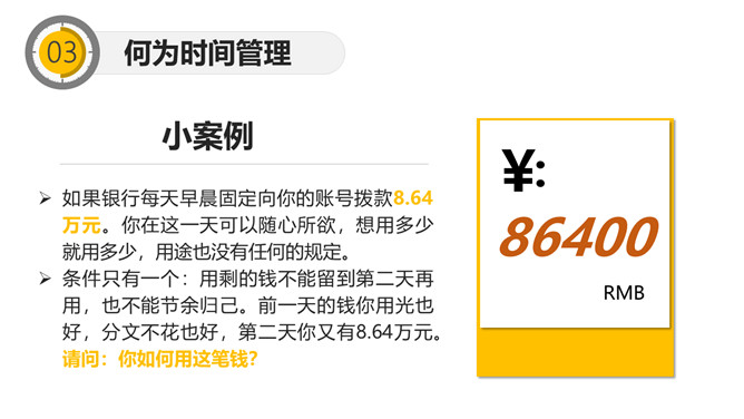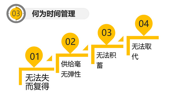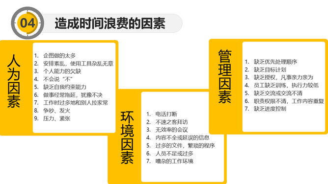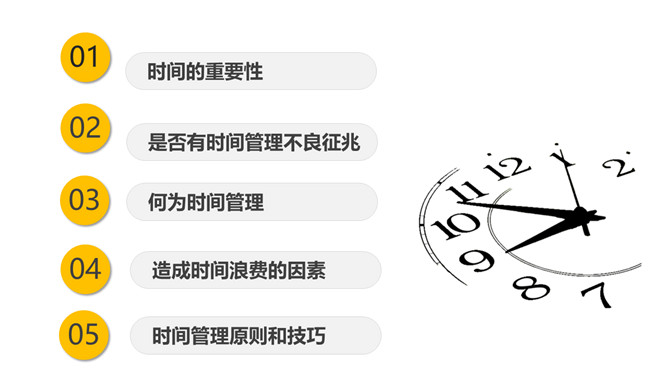 时间管理培训PPT课件模板。内容包括时间的重要性、是否有时间管理不良征兆、何为时间管理、造成时间浪费的因素、时间管理原则和技巧。