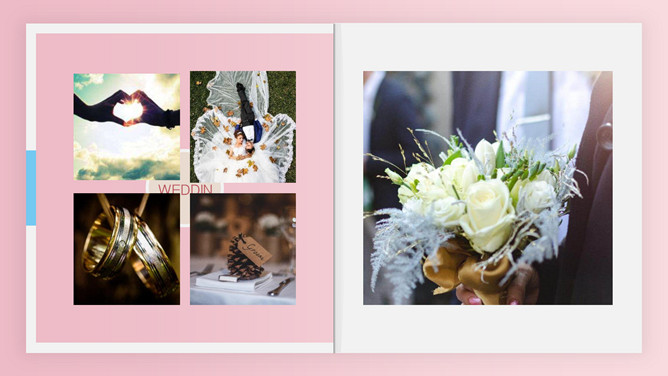 粉色我们结婚了婚礼相册PPT模板。一套结婚婚礼相册模板,红心、花朵封面背景,多种婚纱照图文排版页面。