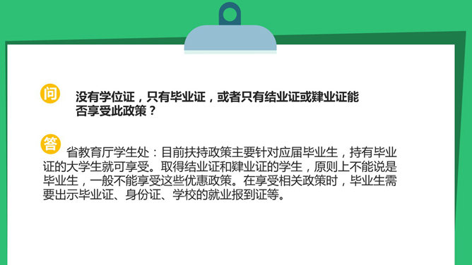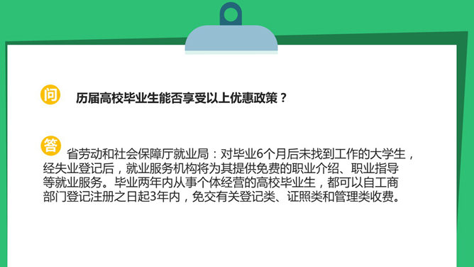 这是一份扁平化PPT设计的典范,动态效果运用的也很娴熟,介绍了大学生创业相关的贷款、补贴等相关优惠政策。
