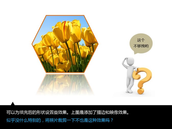 这是一份图片效果处理的PPT教程,讲解形状的图片填充和装饰效果的添加,很实用的教程。