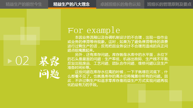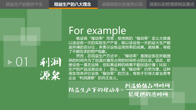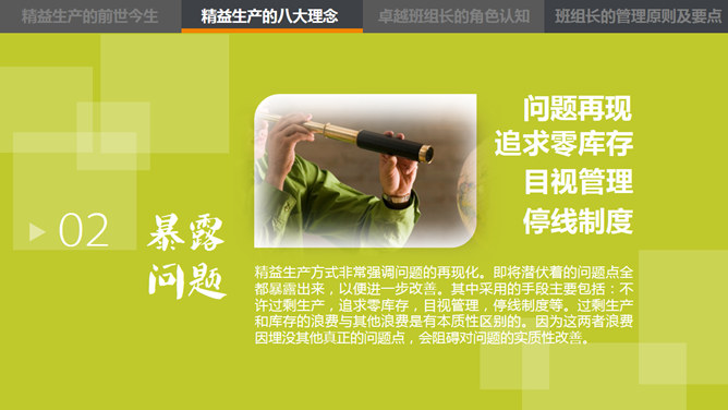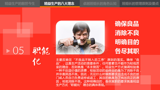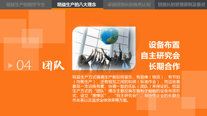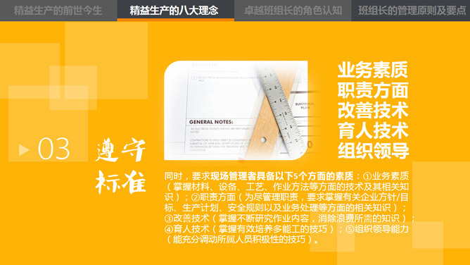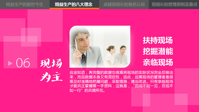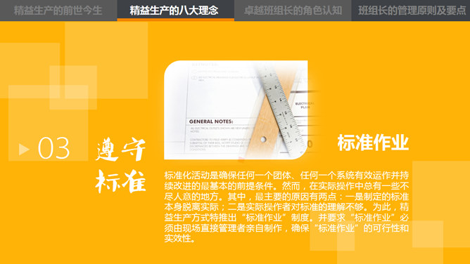 这是一份精益管理培训相关的PPT课件,主题是中层的角色认知,漂亮的动态效果,丰富专业的内容。目录:1、精益生产的前世今生。2、精益生产的八大概念。3、卓越班组长的角色认知。4、卓越班组长的管理原则及要点。使用字体:康煕字典體(Demo)、张海山锐谐体、方正字迹-张颢硬笔楷书、时尚 中黑简体、叶根友特楷简体、华康俪金黑W8(P)。