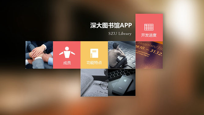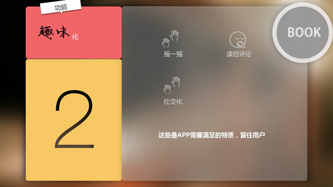 这是一份手机APP介绍PPT,采用了流行的毛玻璃虚化背景和Metro瓷片设计,宽屏版式,漂亮的动态效果,精致时尚。使用字体: