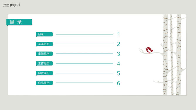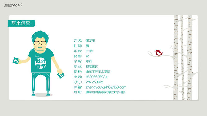 这是一份平面设计师的求职简历PPT,首页以小鸟落在树上为背景,副标题良禽择木而栖,贤臣择主而事。内页以卡通人物介绍的方式展现,设计的非常精美有创意,可惜的是无法编辑,不过也很有参考价值。