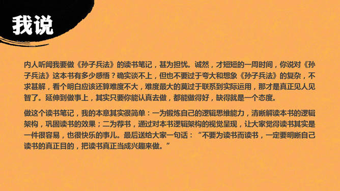 一份《孙子兵法》读书笔记幻灯片,介绍了这本书的作者、概况、战略运筹、作战指挥、战场机变及作者的见解和看法。建议安装字体: