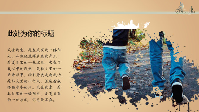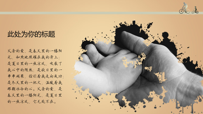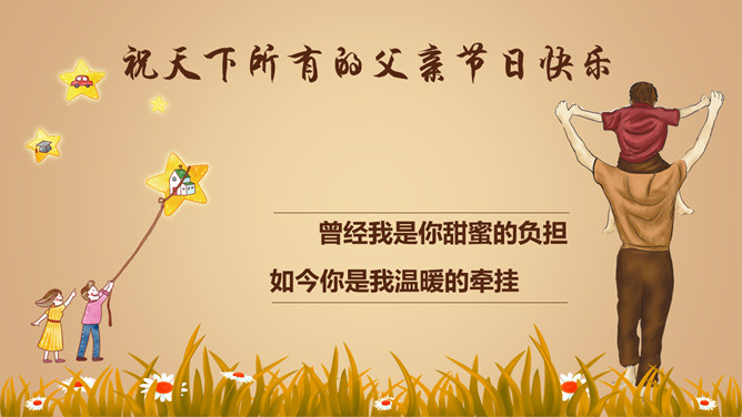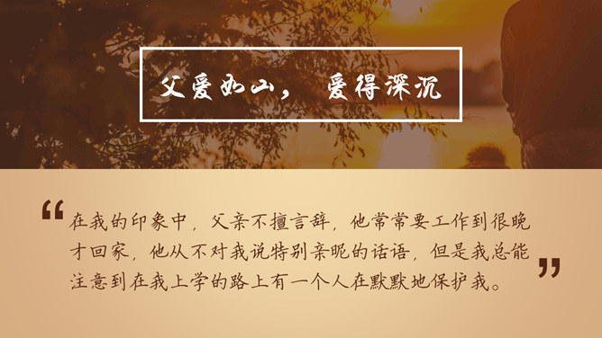 一份父亲节主题PPT模板。我们总是习惯强调母爱的力量,强调母爱最崇高,但事实上,父爱的力量同样伟大。父爱如山,父爱从未走远。建议安装字体:书体坊禚效锋行草体、方正硬笔楷书简体、迷你简雪君、华文新魏、迷你简习字。