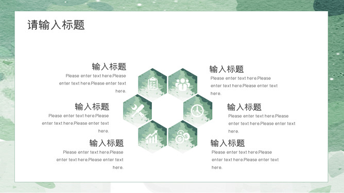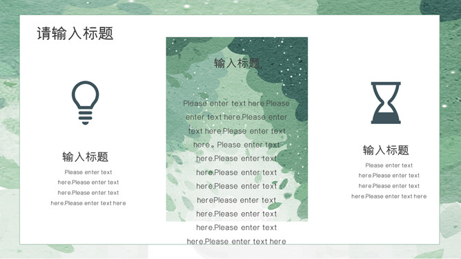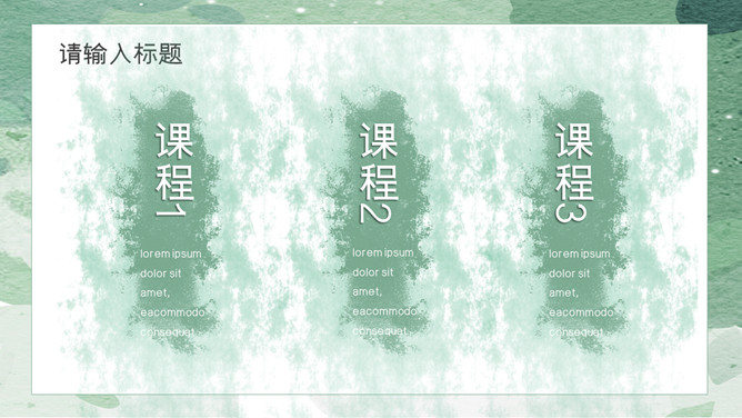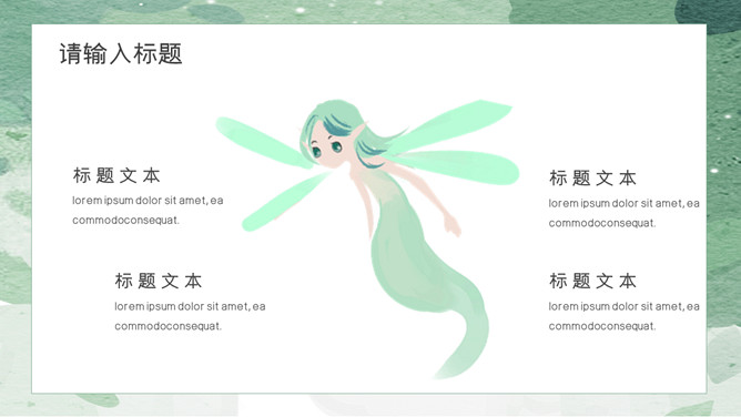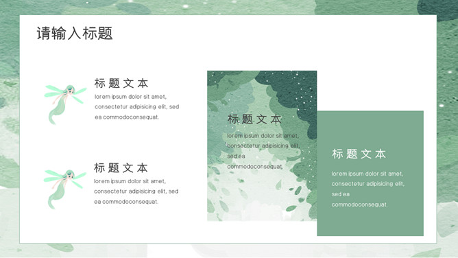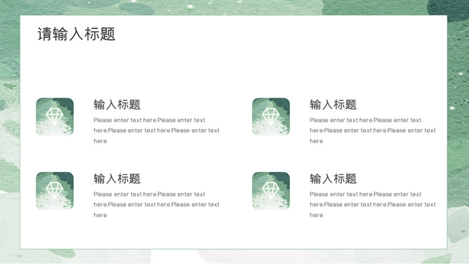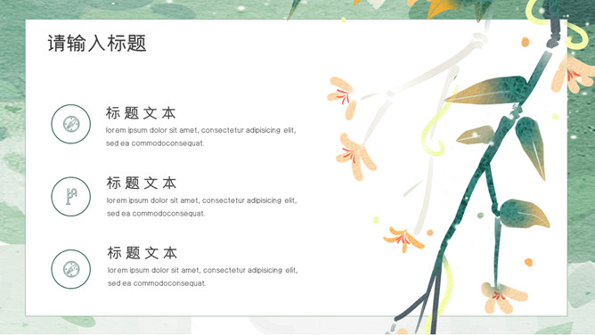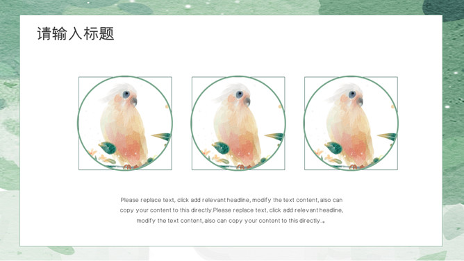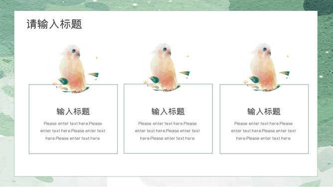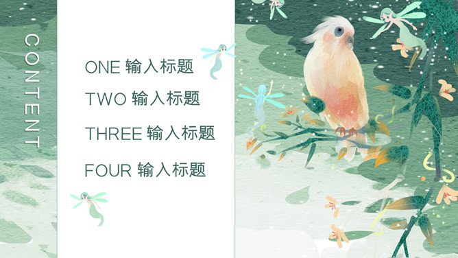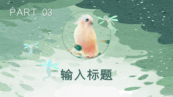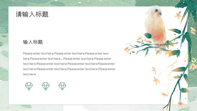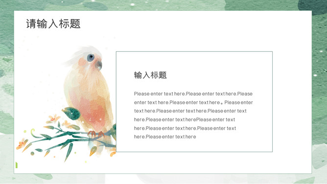 插画风水彩鹦鹉PPT模板。一套插画风格设计模板,站在枝头的鹦鹉主元素,森系绿色主色调,水彩效果。