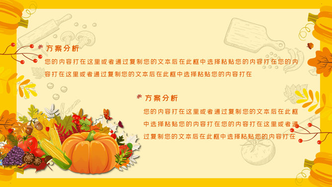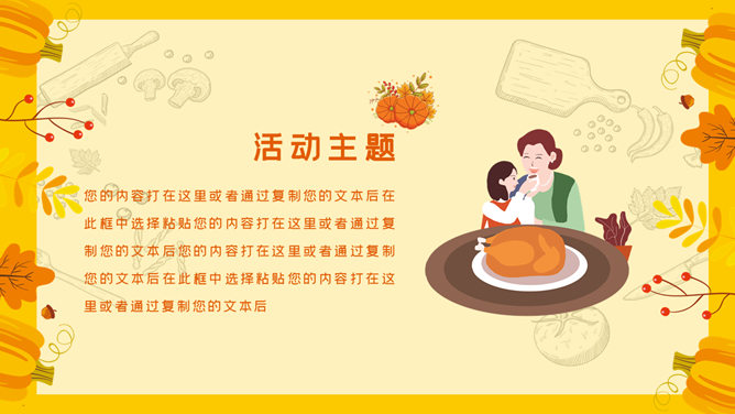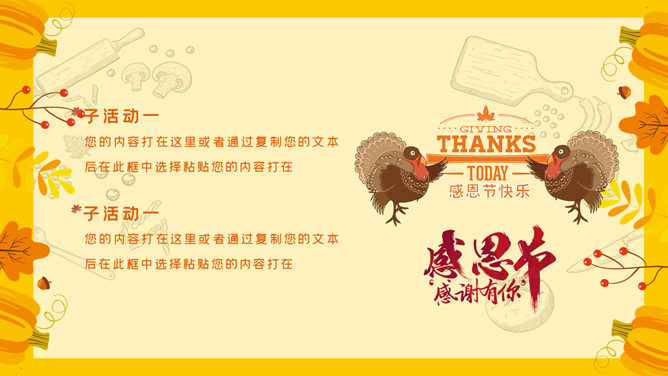 卡通感恩节活动策划PPT模板。一套美国北美感恩节活动策划方案幻灯片模板,卡通设计风格。