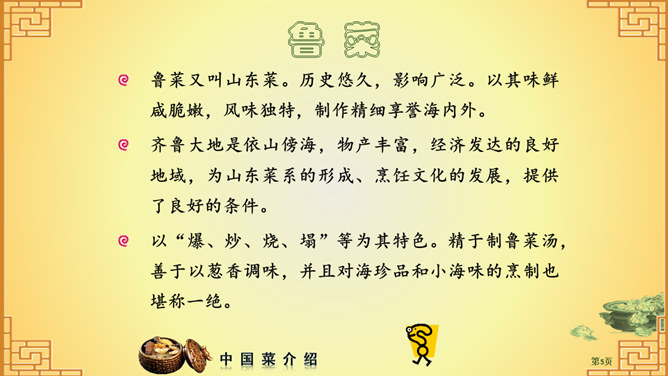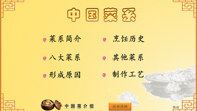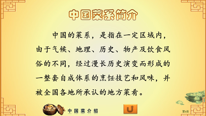 中国菜系介绍PPT。内容包括:菜系简介、烹饪历史、八大菜系、其他菜系、形成原因、制作工艺。使用字体: