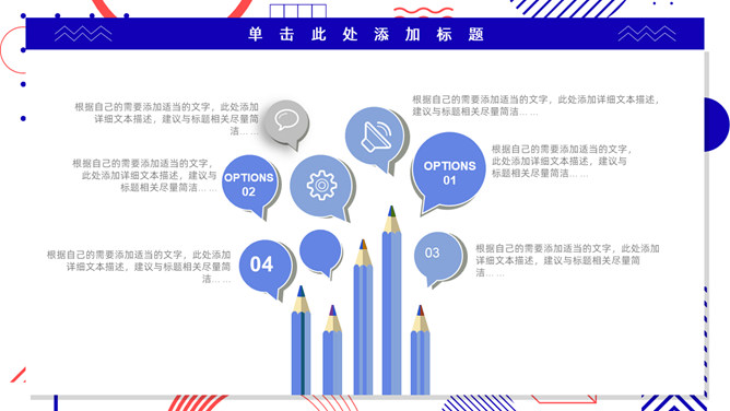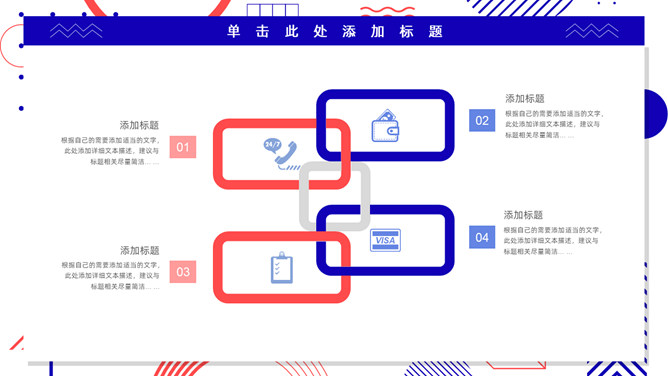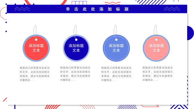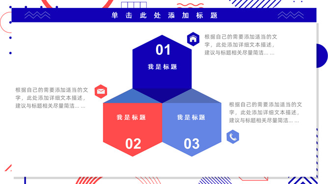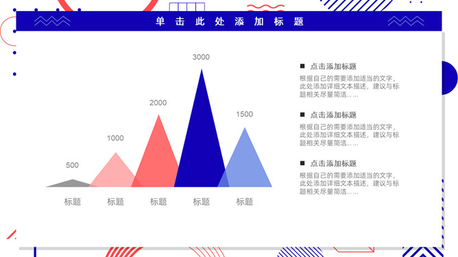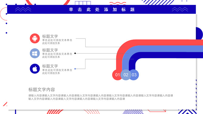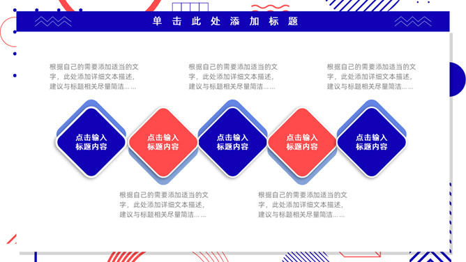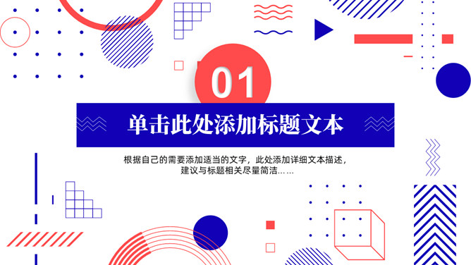 红蓝撞色孟菲斯风格PPT模板。一套通用工作汇报模板,大胆红蓝撞色配色,时尚孟菲斯风格设计。