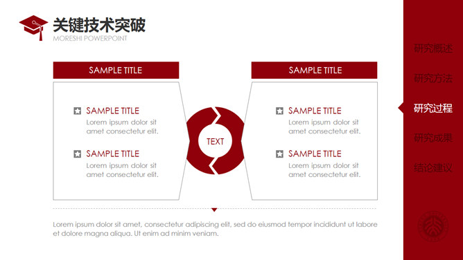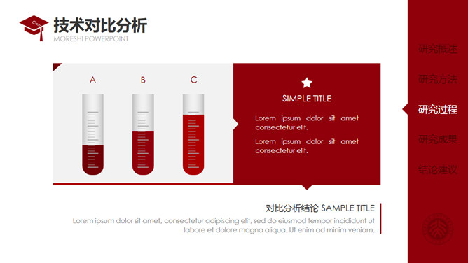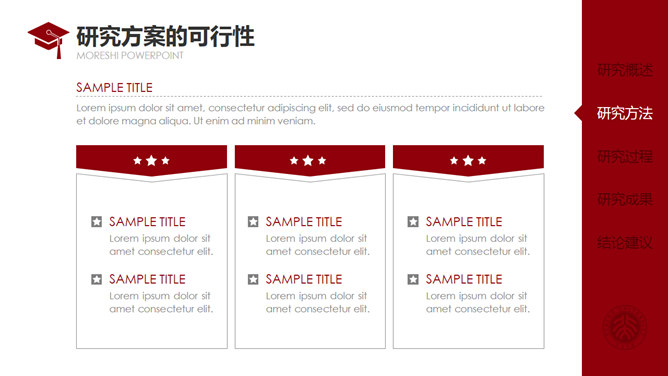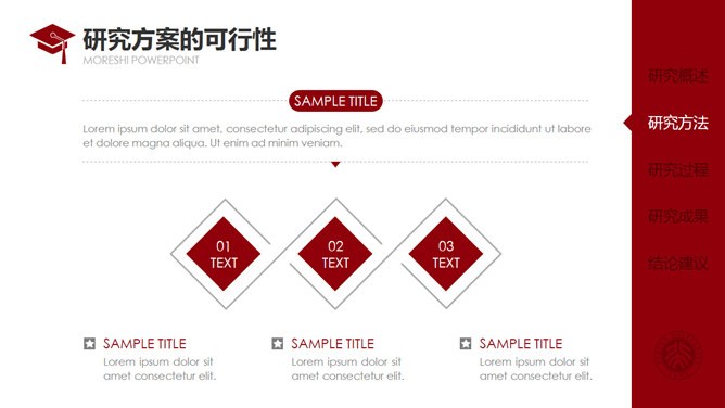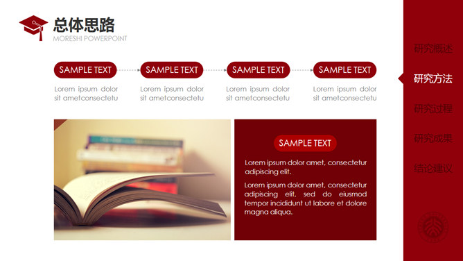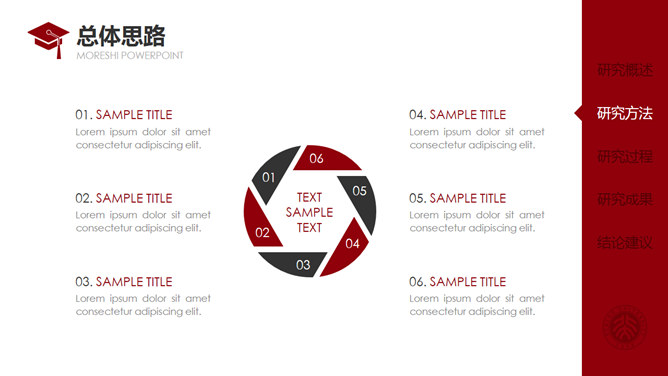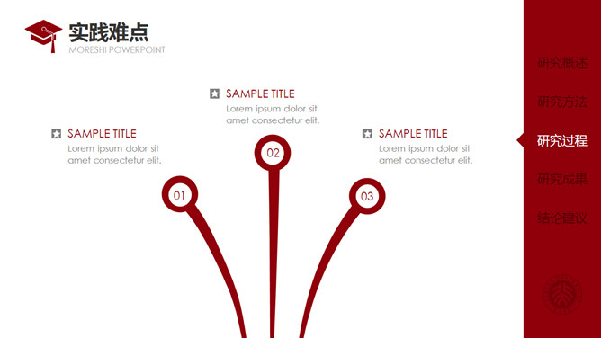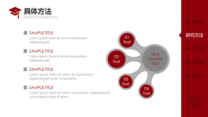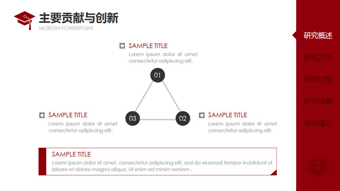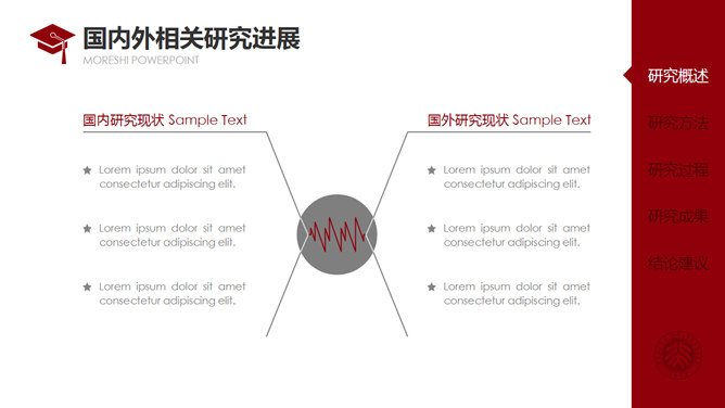 红色侧边导航论文答辩PPT模板。一套通用毕业设计论文答辩pptt模板,热情暗红色主色调,侧边栏目录导航,动态播放演示,使用字体: