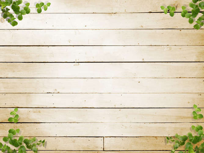 一份清新自然的幻灯片图片,以自然木纹木条为背景,四周用绿叶、茶杯、铅笔装饰,中间是漂亮的心形花环。