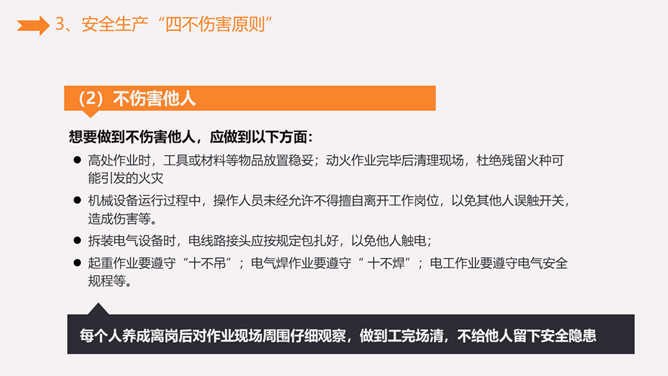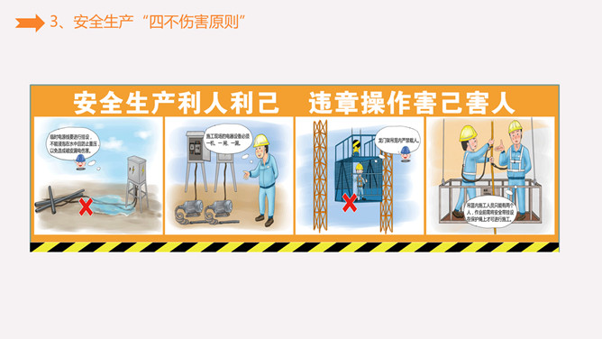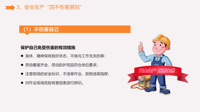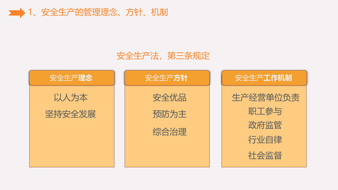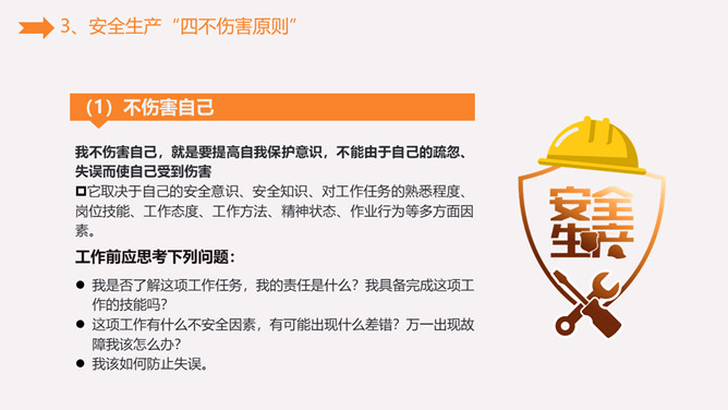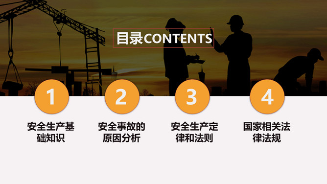 安全生产知识培训PPT课件模板。包括安全生产基础知识、安全事故的原因分析、安全生产定律和法则、国家相关法律法规等部分。