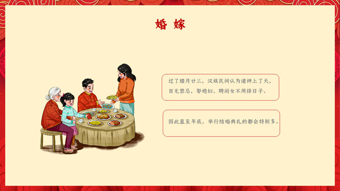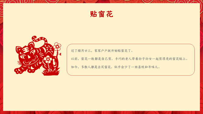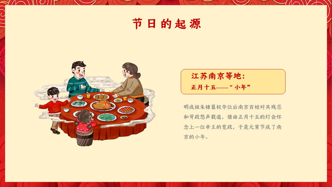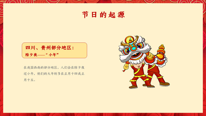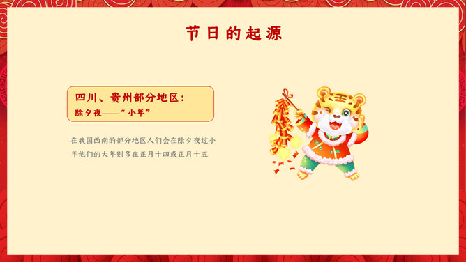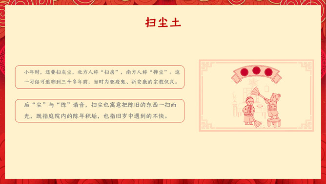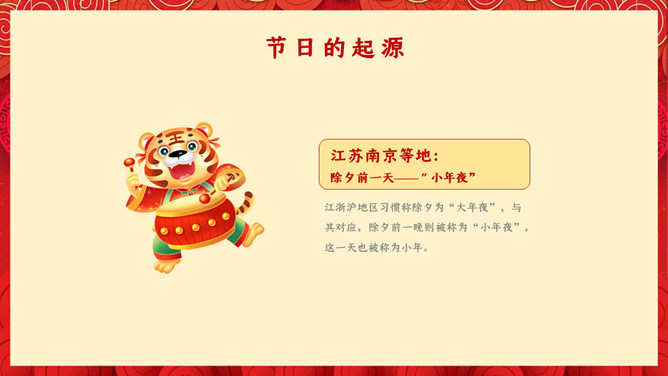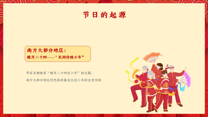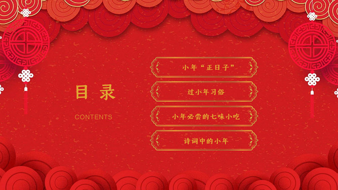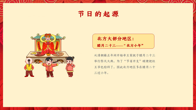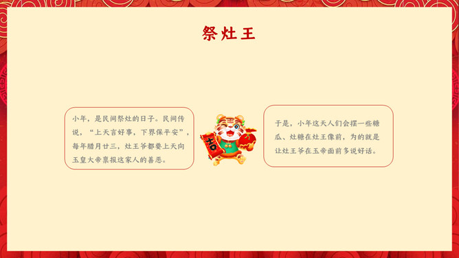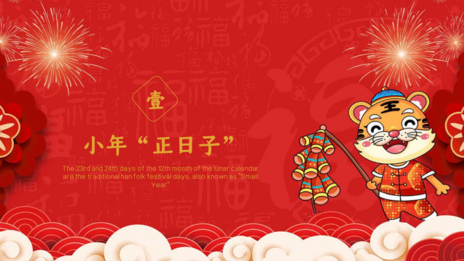 过小年习俗介绍PPT模板。内容包括小年“正日子”、过小年习俗、小年必尝的七味小吃、诗词中的小年。