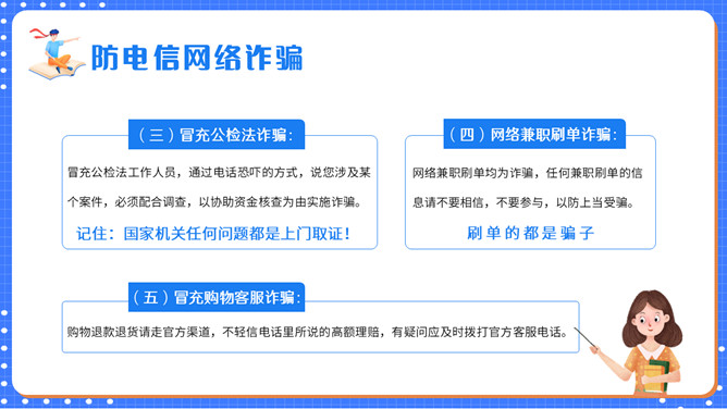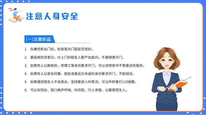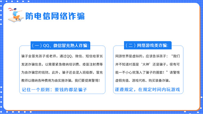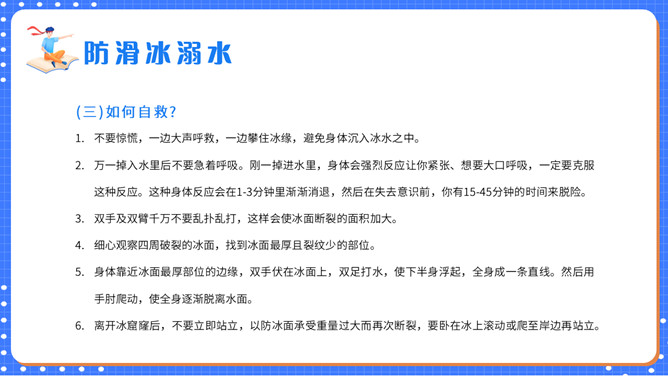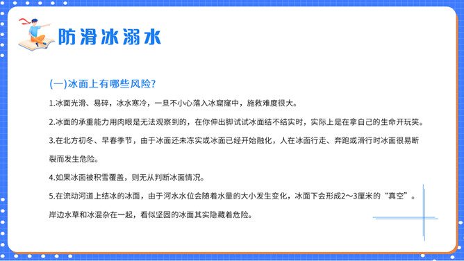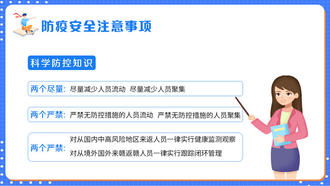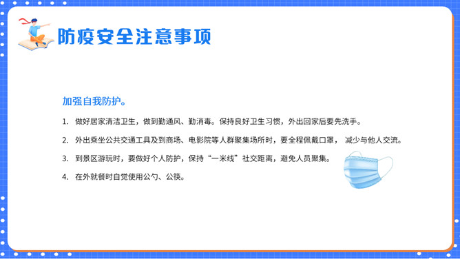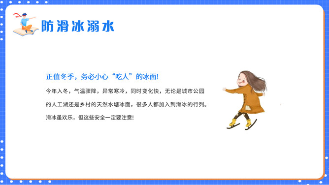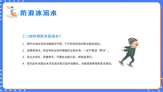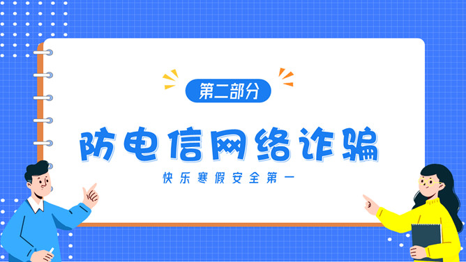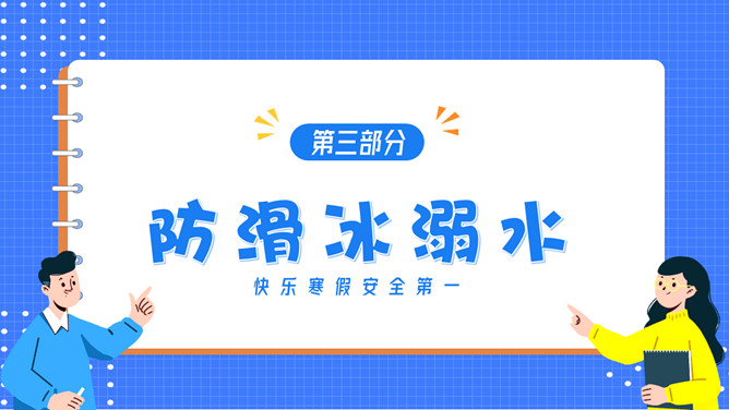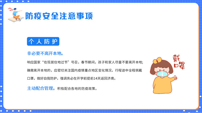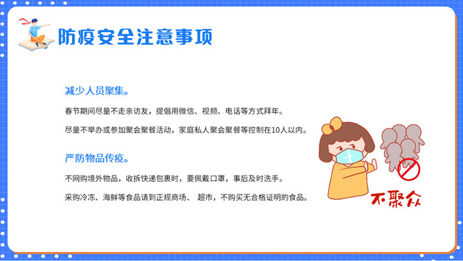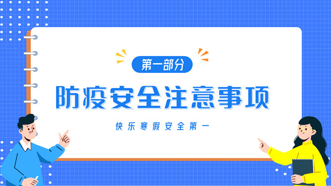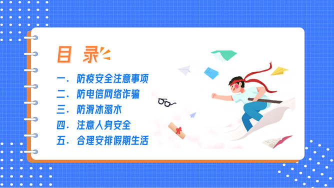 寒假安全教育主题班会课件PPT模板。内容包括防疫安全注意事项、防电信网络诈骗、防滑冰溺水、注意人身安全、合理安排假期生活。