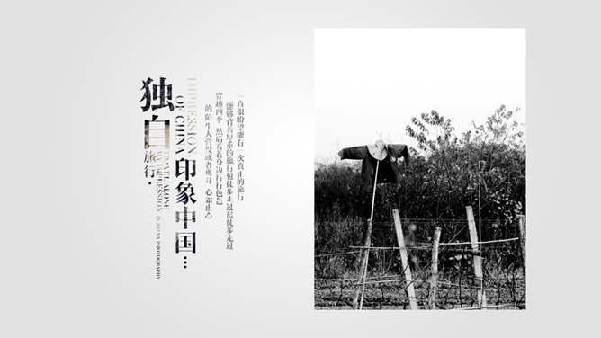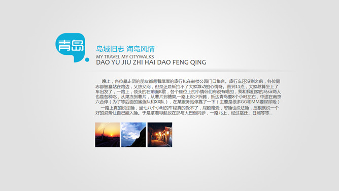 一份适合制作旅行心情日志日记的幻灯片模板,风格简约,很有艺术效果的设计,也可用于制作旅游景点介绍PPT。使用字体: