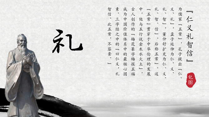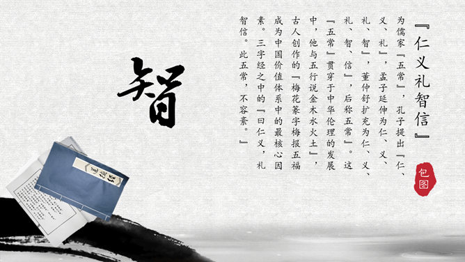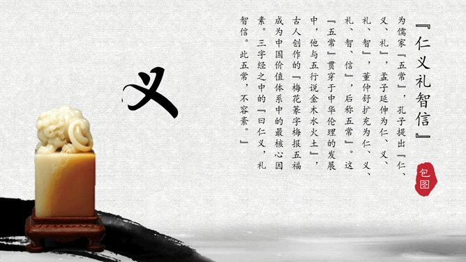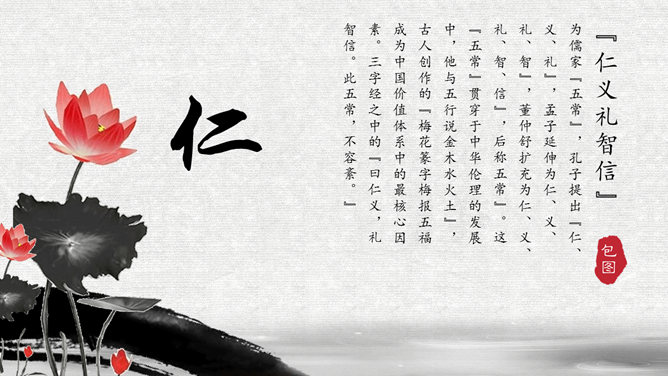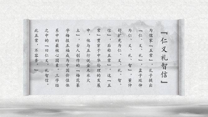 一份介绍中国传统文化道德的中国风PPT模板,采用水墨梅花、墨迹等中国元素设计,竖行文字排版,有中国文化韵味。使用字体: