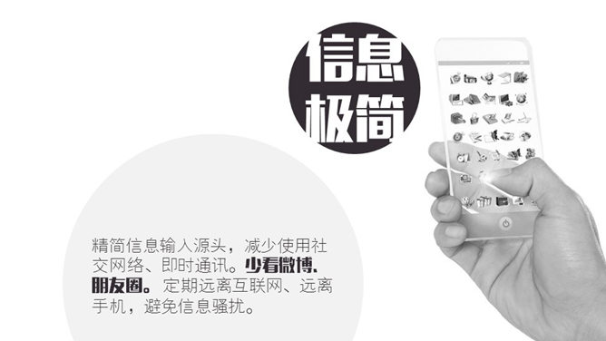 妙手回春PPT作品。极简的生活方式是一种人生态度,包括欲望、精神、物质、信息、表达、工作,全方位的简化。建议安装字体: