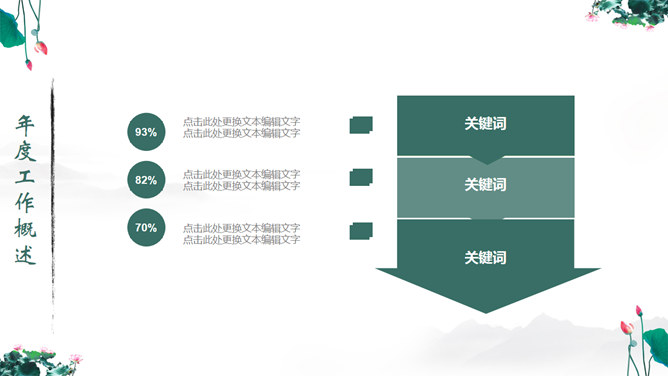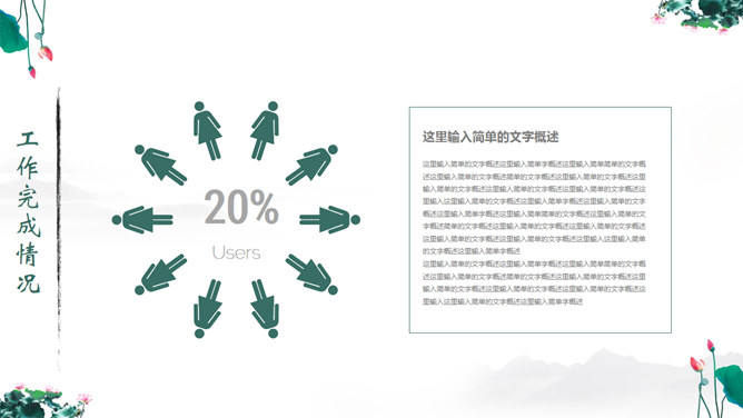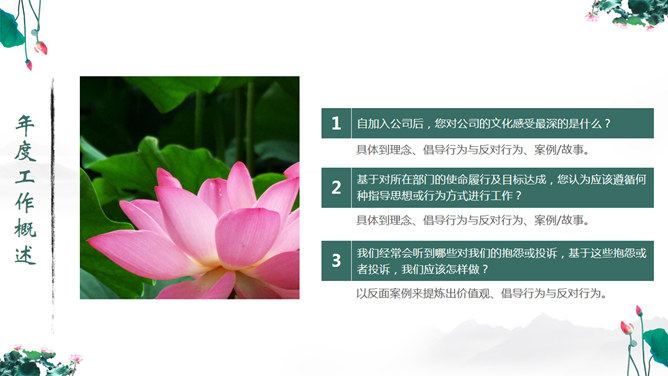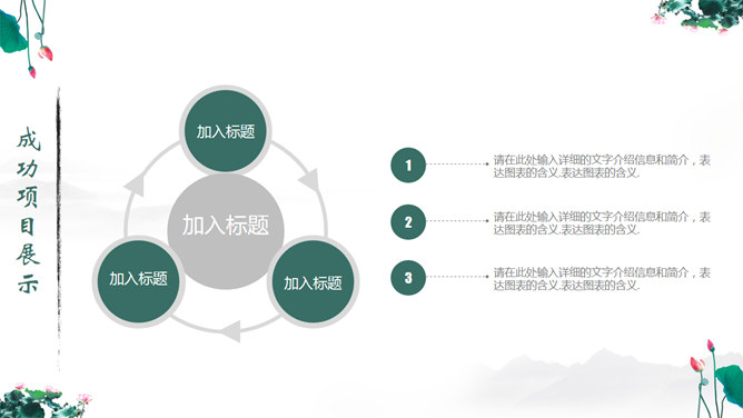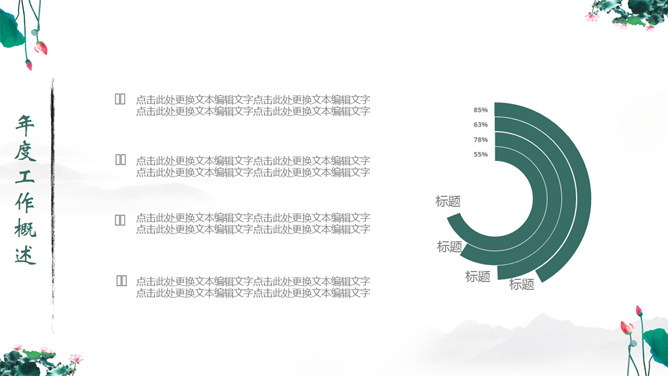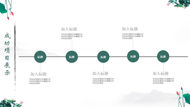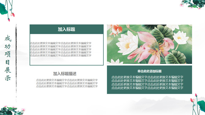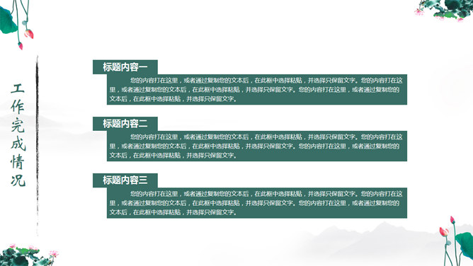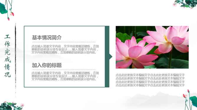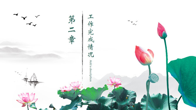 一份中国风PPT模板,以水墨荷花为背景,动态水波纹效果,还有古典优美的背景音乐。使用字体: