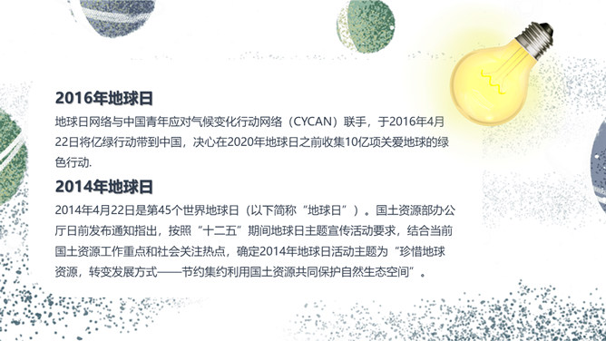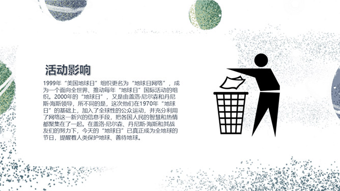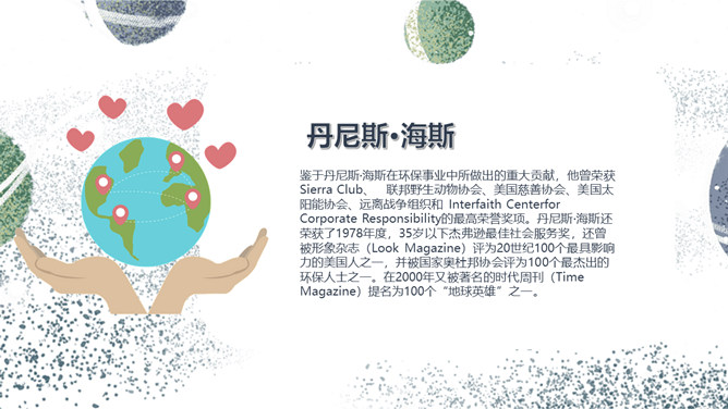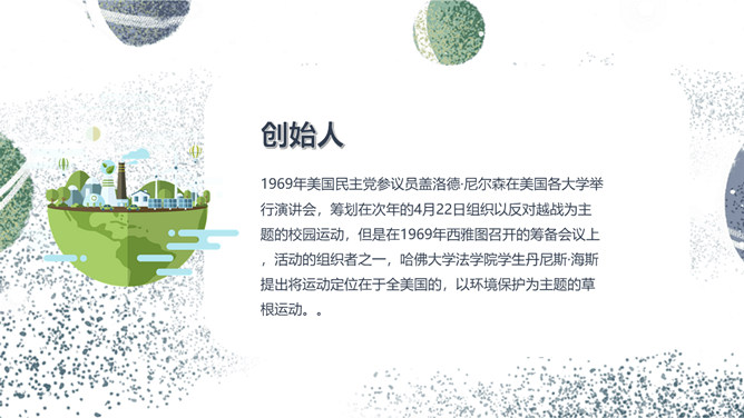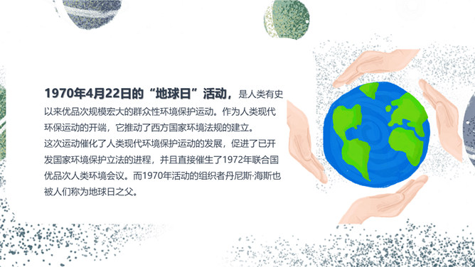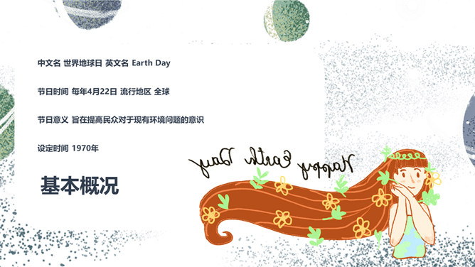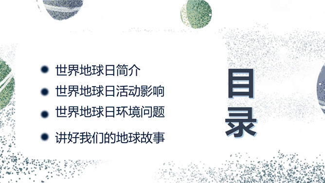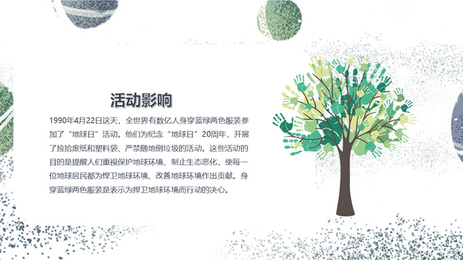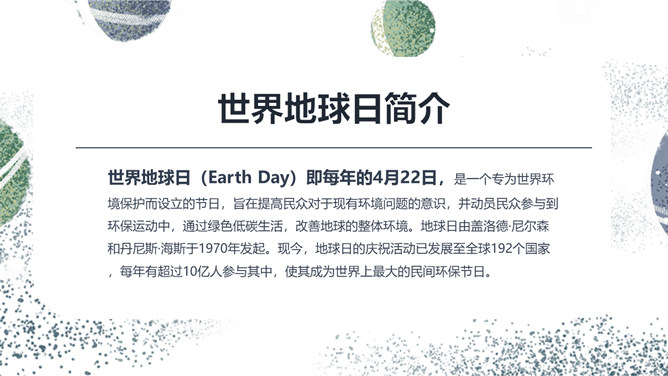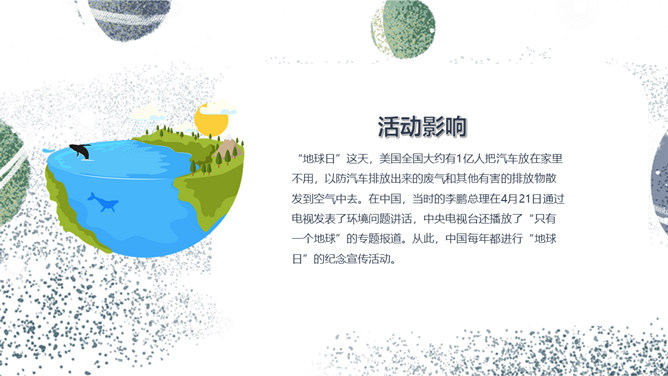 世界地球日环保宣传PPT模板。包地球日简介、活动影响、环境问题和讲好我们的地球故事等内容。