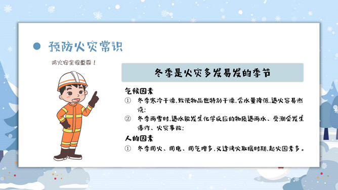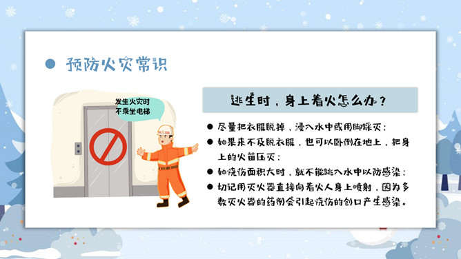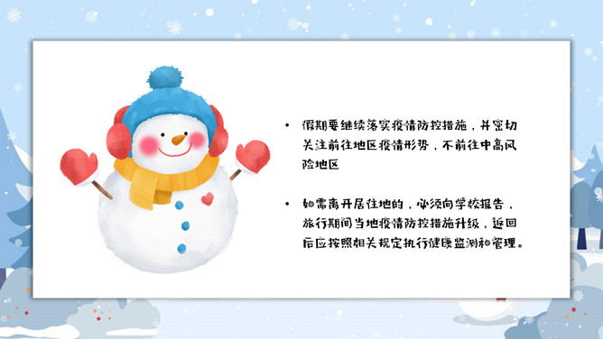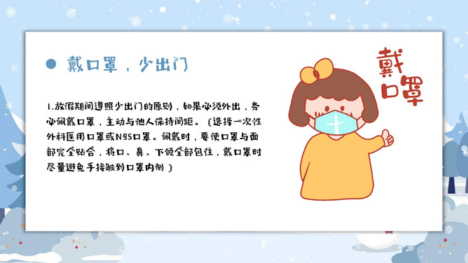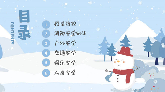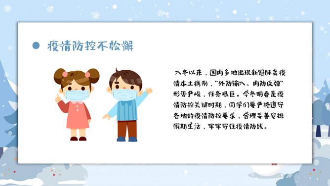寒假假期安全事项教育PPT模板。内容包括疫情防控、消防安全知识、户外安全、交通安全、娱乐安全、人身安全。