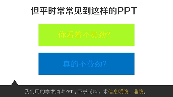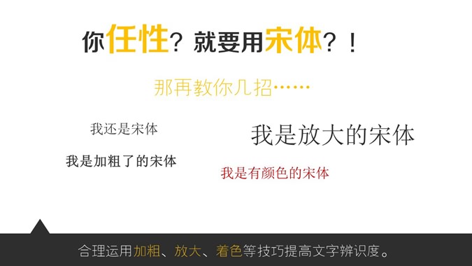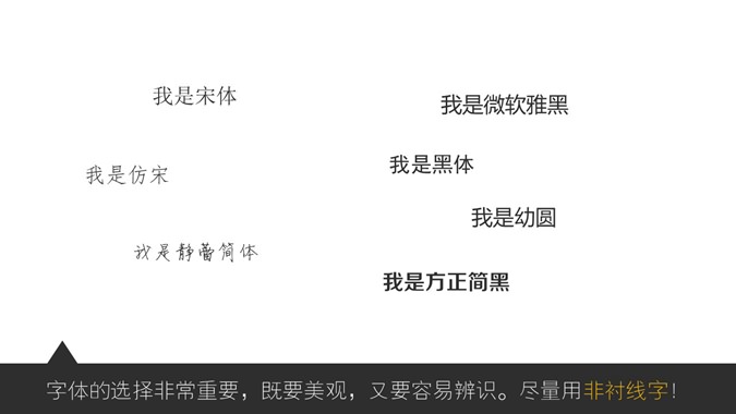 一份轻松幽默风格的PPT设计要点介绍。PPT的本质功能是将你的成果、想法变得简单易懂,并吸引人!以内容为中心!字体的选择非常重要,既要美观,又要容易辨识。尽量用非衬线字!