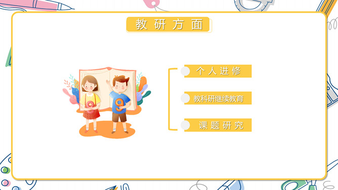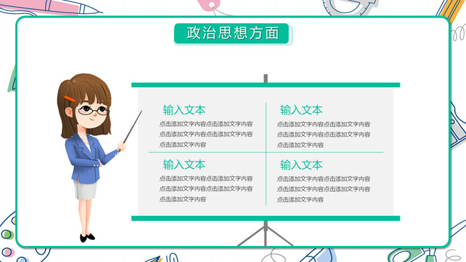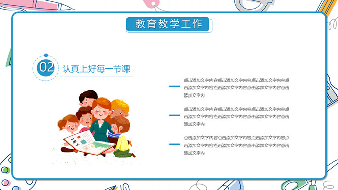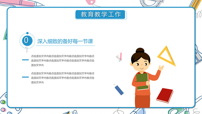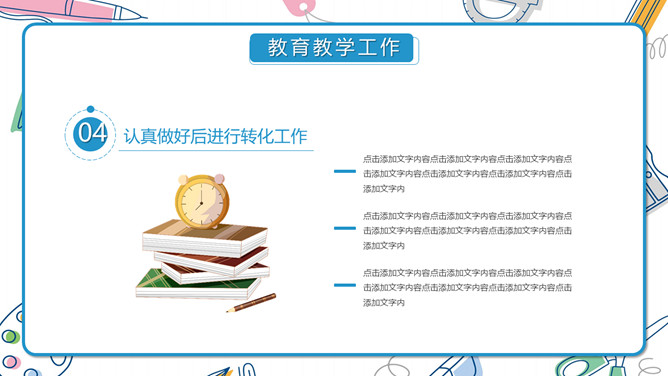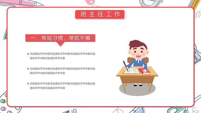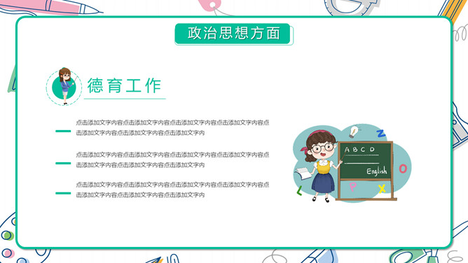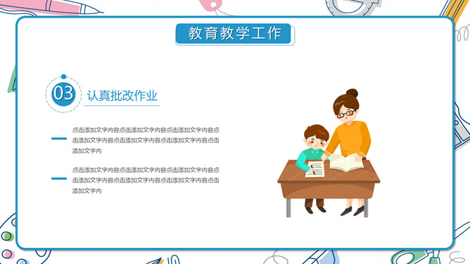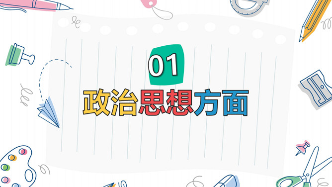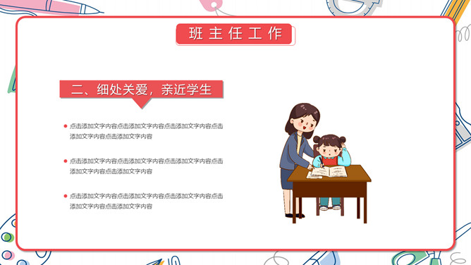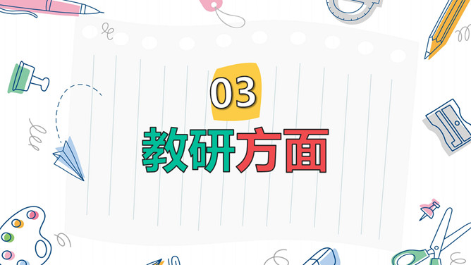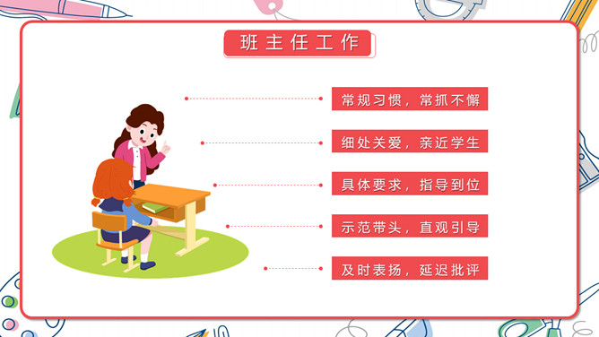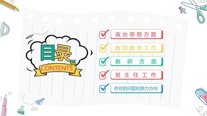 教师班主任工作总结汇报PPT模板。一套班主任教师年终工作总结报告幻灯片模板,彩色配色,文具元素装饰。