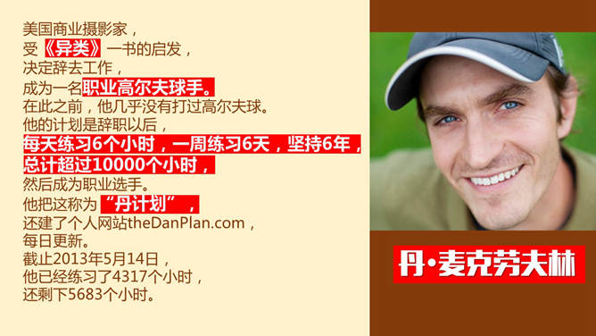 一万小时天才理论是美国作者丹尼尔·科伊尔写的一本励志书,作者拜访了各行各业的成功人士,发现这些人都是经过了高强度的长期训练才在自己的领域取得常人达不到的成就。