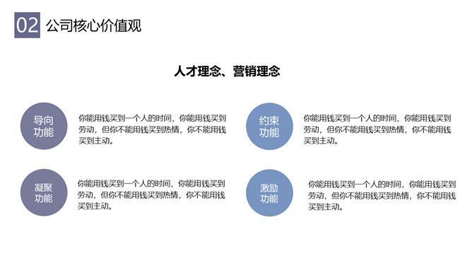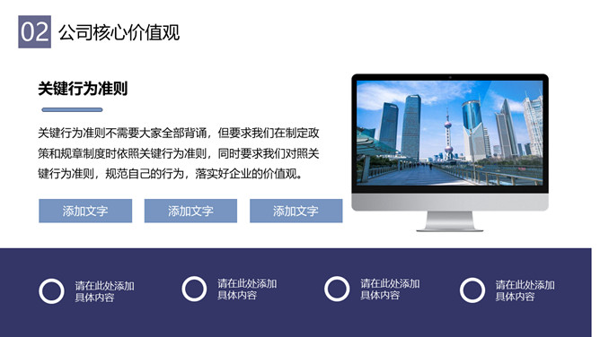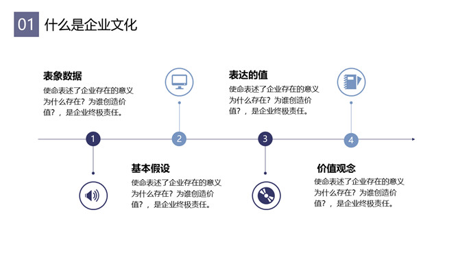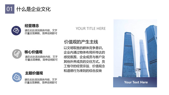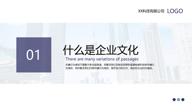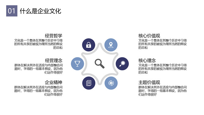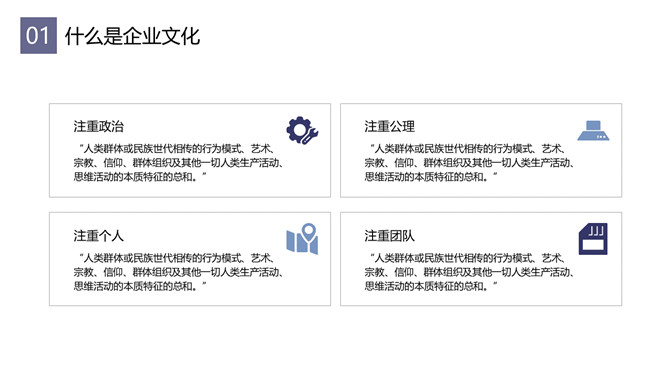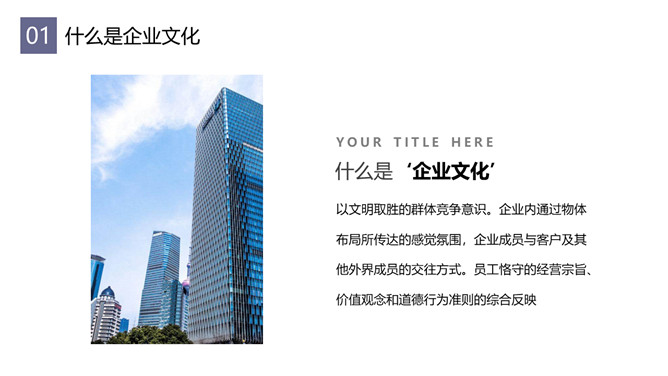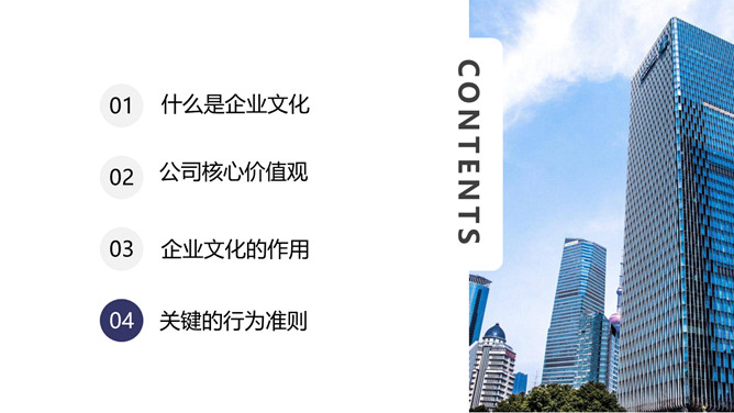 企业文化培训PPT课件模板。包括什么是企业文化、公司核心价值观、企业文化的作用、关键的行为准则等内容。