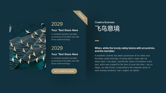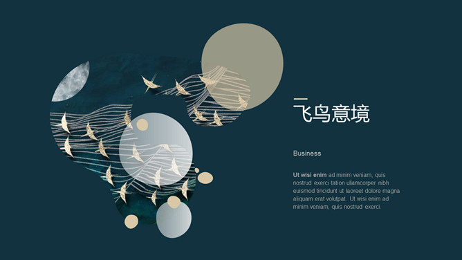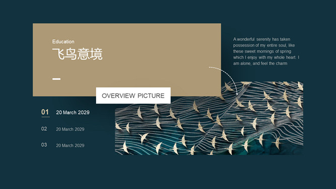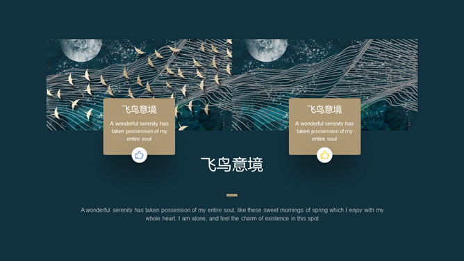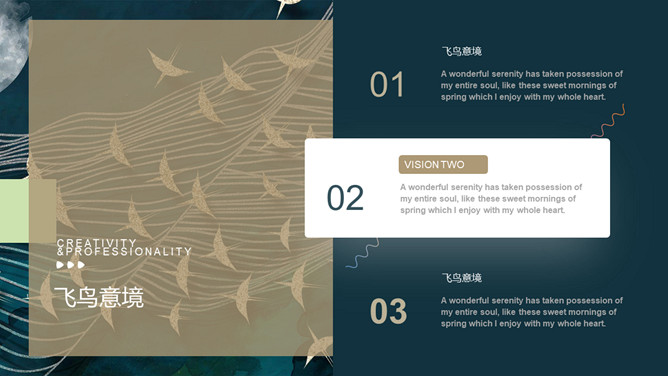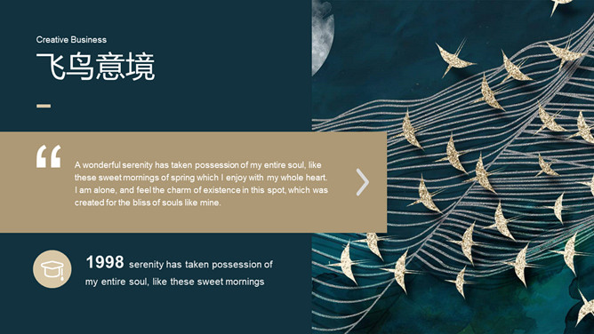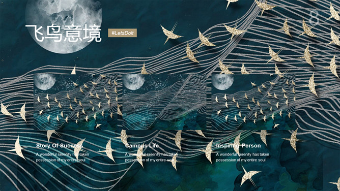 精美意境艺术飞鸟集PPT模板。一套精美设艺术计模板,创意群鸟飞鸟背景,深绿主色调,很有意境和美感。