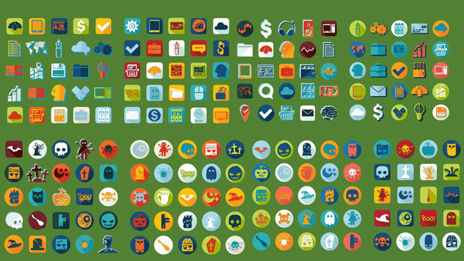 彩色扁平化PPT小图标素材,共200个,其中有100个万圣节相关的PPT小图标。云计算 平板 电脑 美元符号 齿轮 地图。