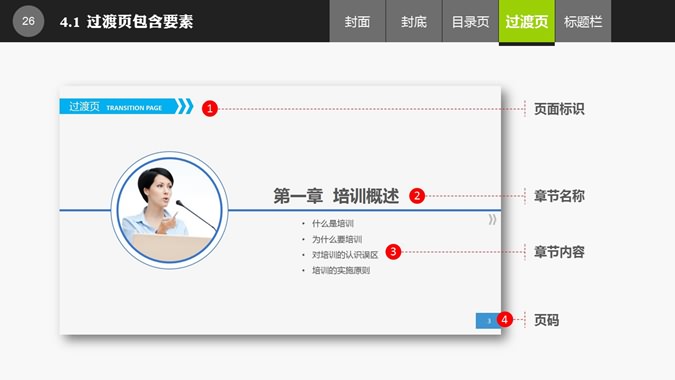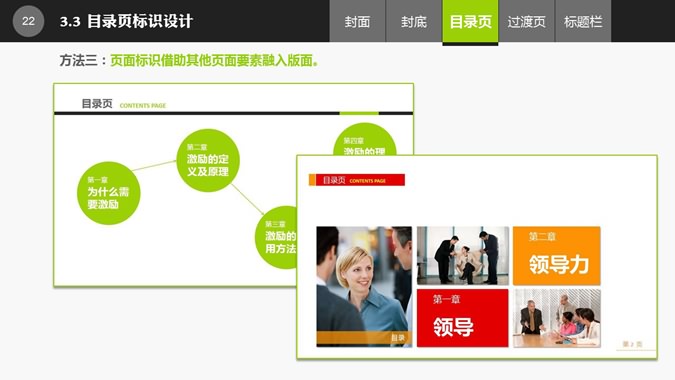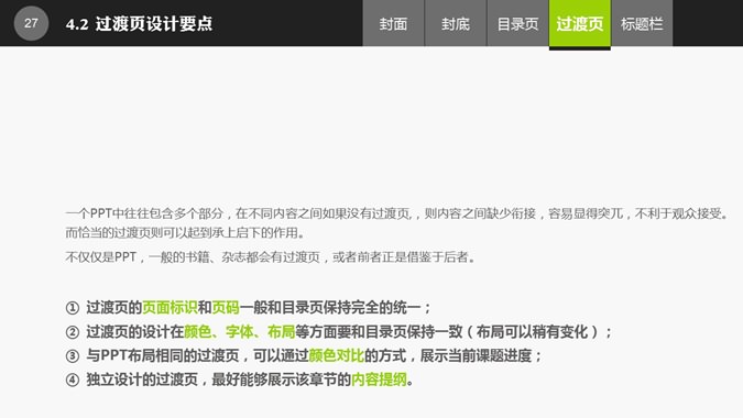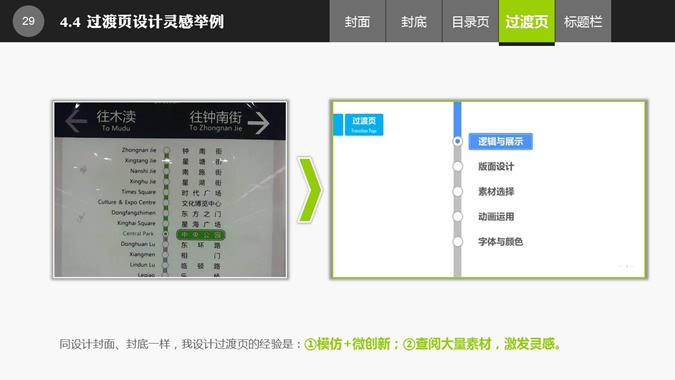 布衣公子的PPT整体设计教程,共35页,内容丰富,讲解细致,介绍了封面、封底、目录页、过渡页、标题栏的设计经验。